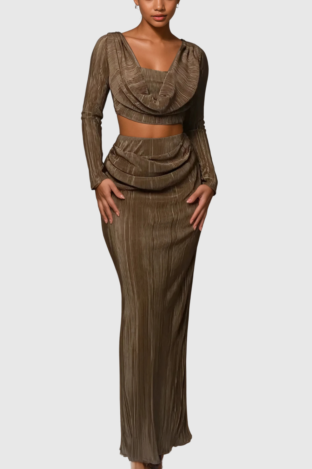 Dieses Alexei Cowl Neck Ruch Pants Set vereint Stil und Komfort perfekt. Der Wasserfallausschnitt verleiht einen Hauch von Eleganz, während die gerüschte Hose für eine schmeichelhafte Passform sorgt. Hergestellt aus weichem, braunem Stoff, ist dieses Set perfekt für jeden Anlass. Werten Sie Ihre Garderobe mit diesem Must-have-Set auf.