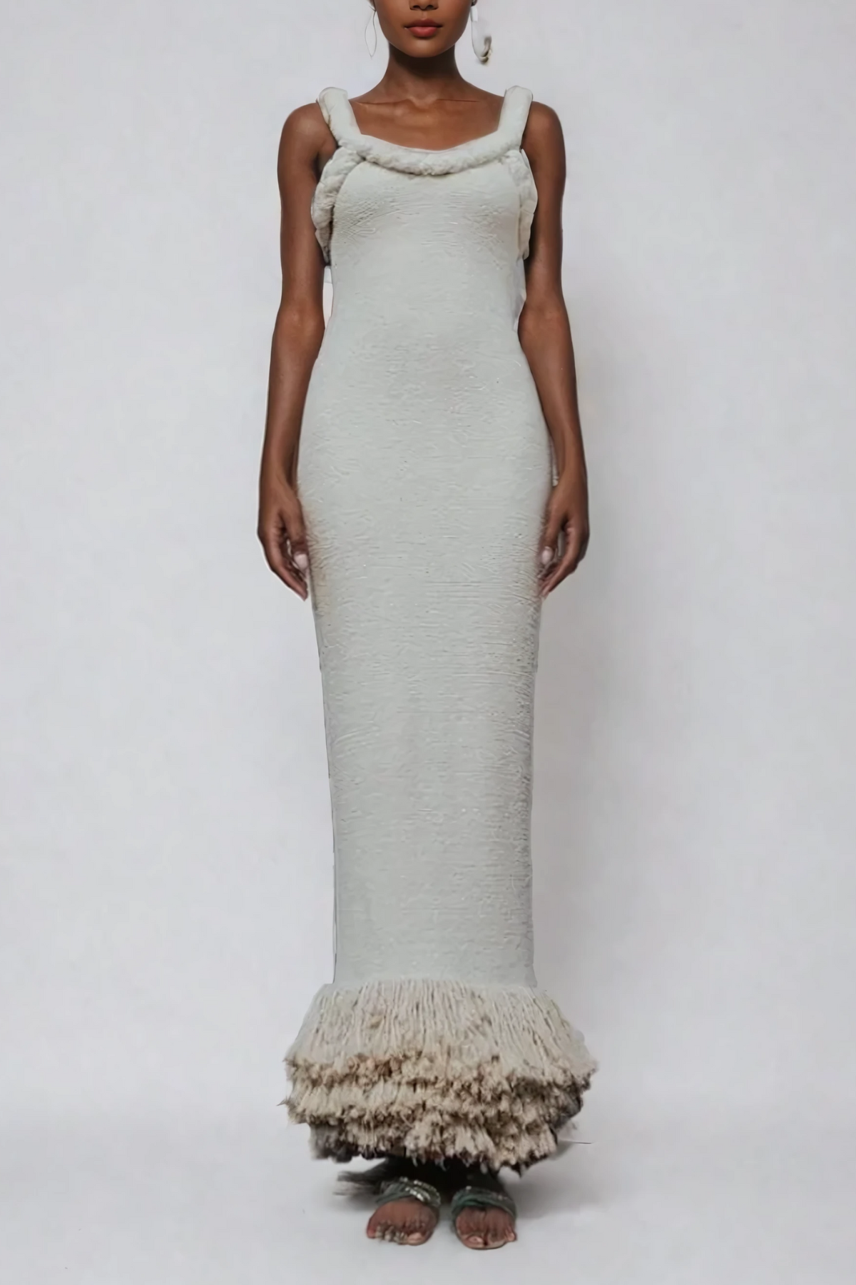 Werten Sie Ihre Garderobe mit dem Alvis Bodycon Fringe Twist Knit Maxikleid auf. Mit aufwendigen Fransendetails und einem schmeichelnden Twist-Strick-Design verspricht dieses Kleid eine atemberaubende Silhouette. Fachmännisch für eine figurbetonte Passform geschnitten, ist es perfekt für jeden formellen Anlass. Ziehen Sie die Blicke auf sich und strahlen Sie Eleganz aus mit diesem Must-have-Kleid.