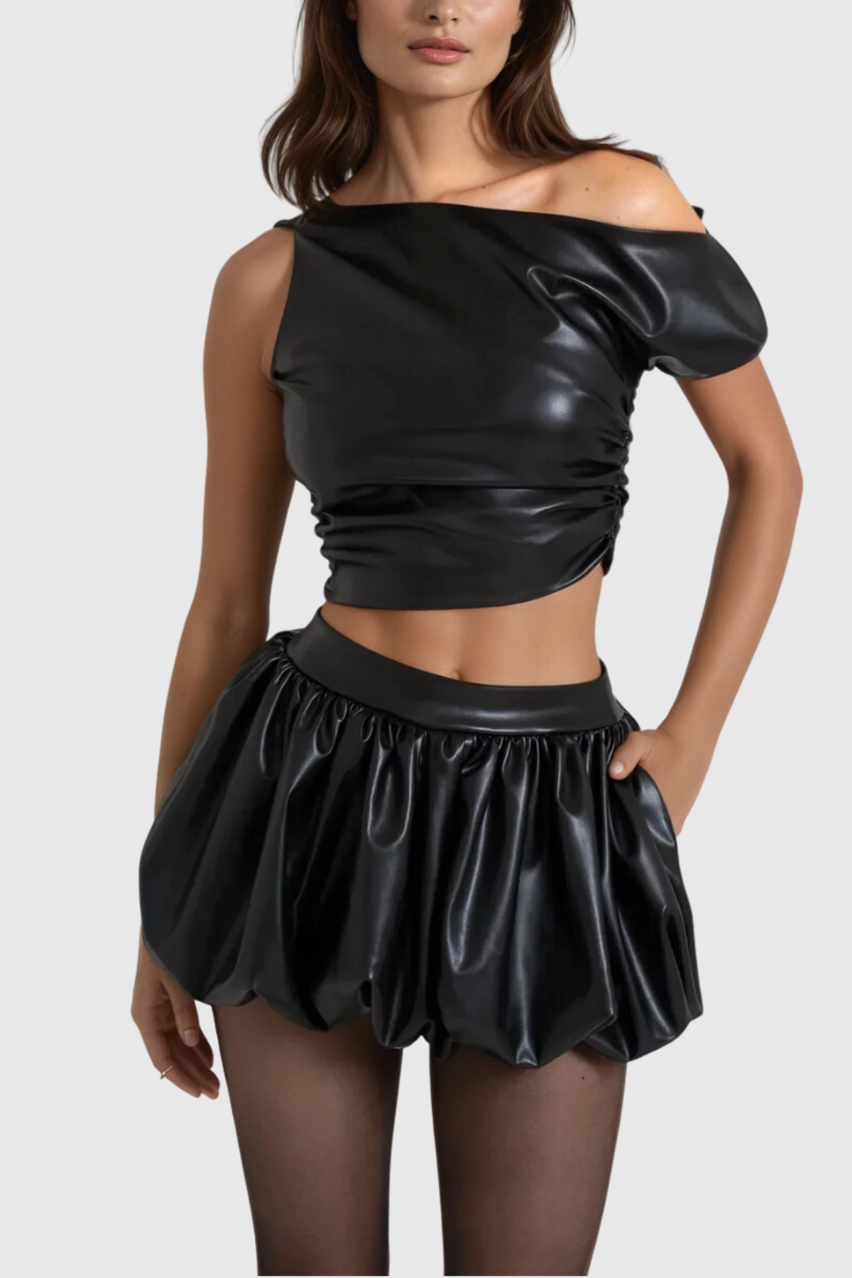 Werten Sie Ihre Garderobe mit dem asymmetrischen Lederrock-Set Alyria Ruch mit Rüschen auf. Hergestellt aus hochwertigem Leder. Dieses Set besticht durch sein einzigartiges Rüschendesign und asymmetrische Rüschen, die jedem Outfit einen Hauch von Eleganz und Stil verleihen. Die perfekte Ergänzung für modebewusste Frauen.