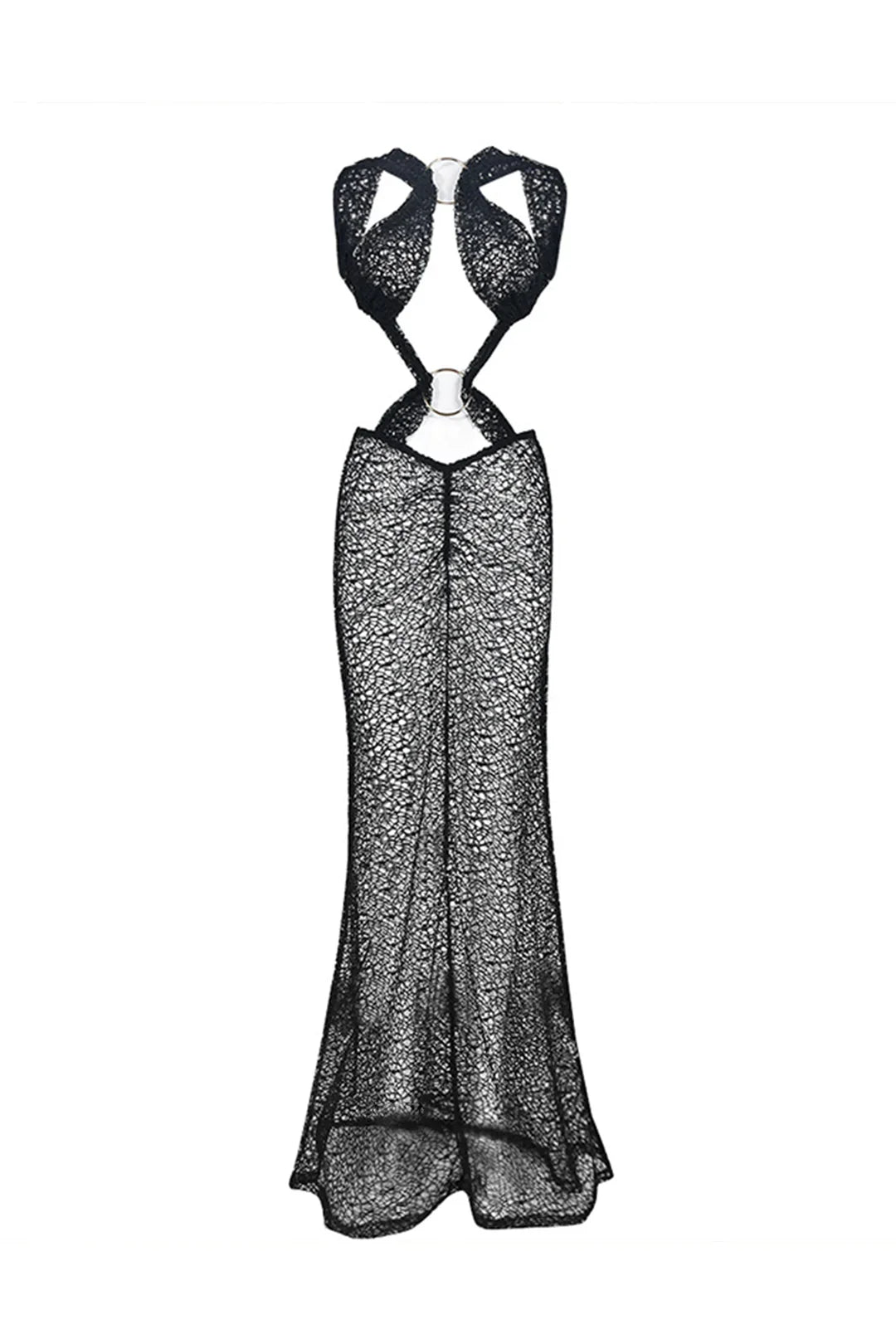 Dieses auffällige Kleid verfügt über ein Netzmuster mit kreisförmigen Metallakzenten und sorgt für einen gewagten Look, der die Blicke auf sich zieht.