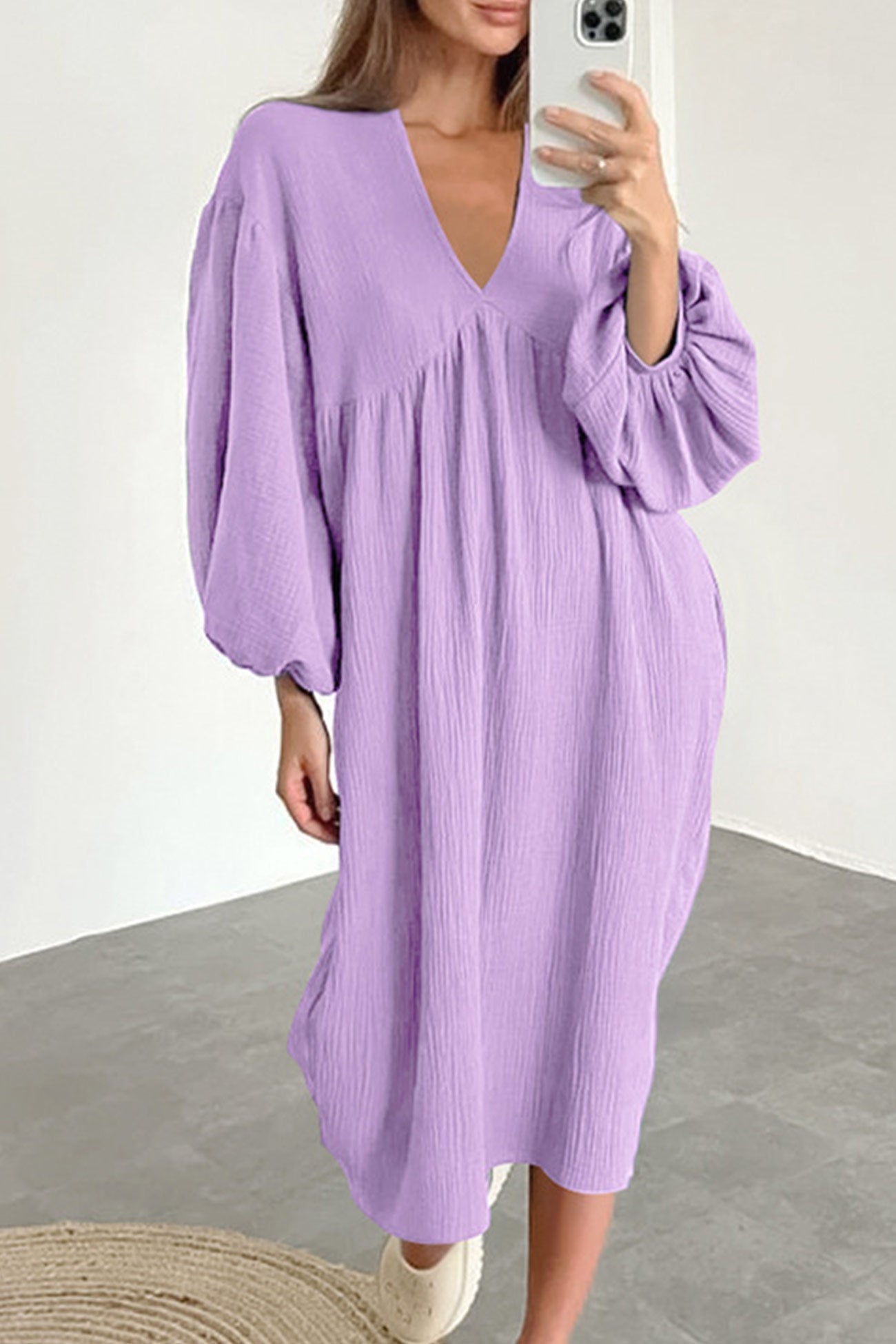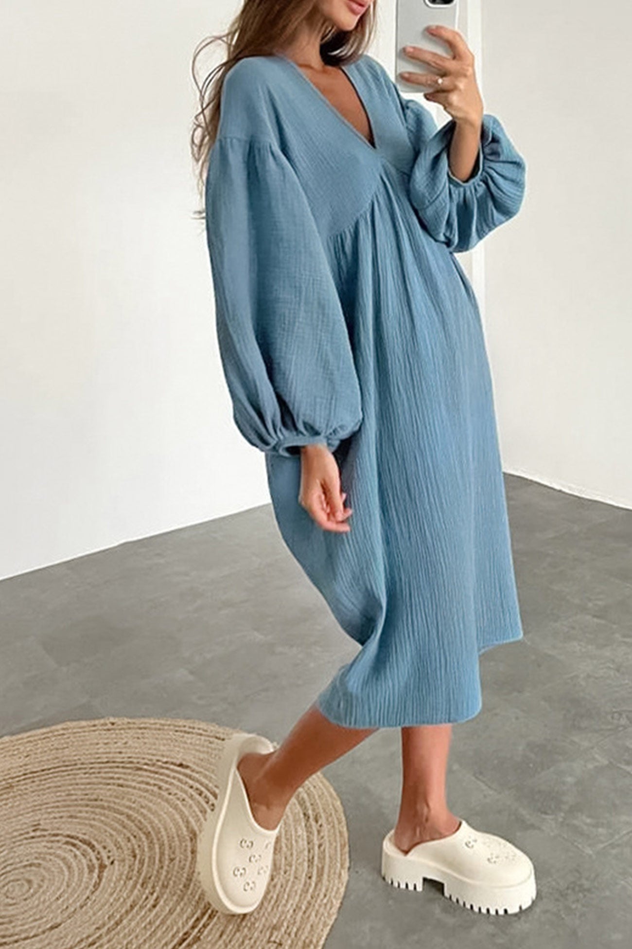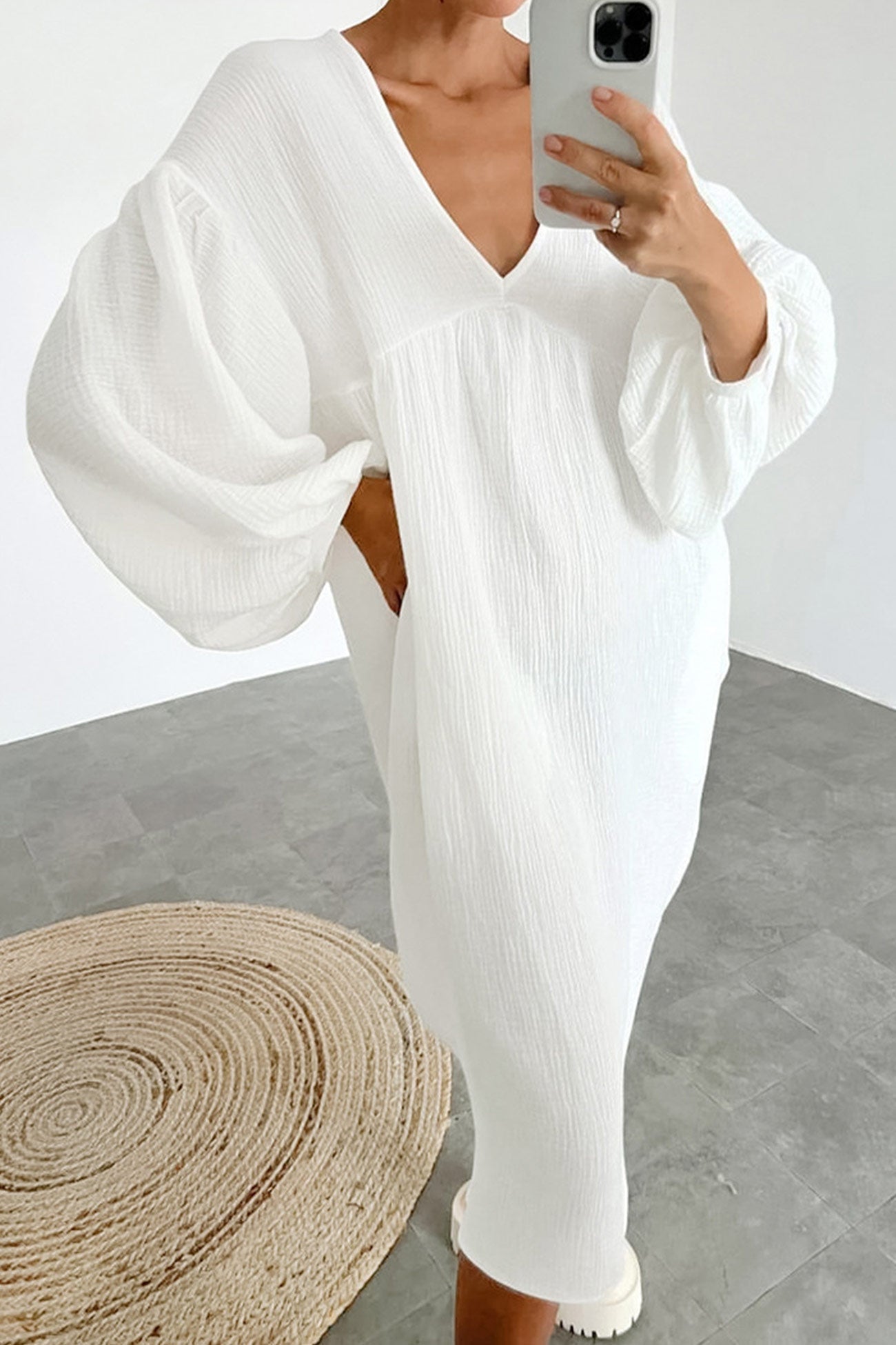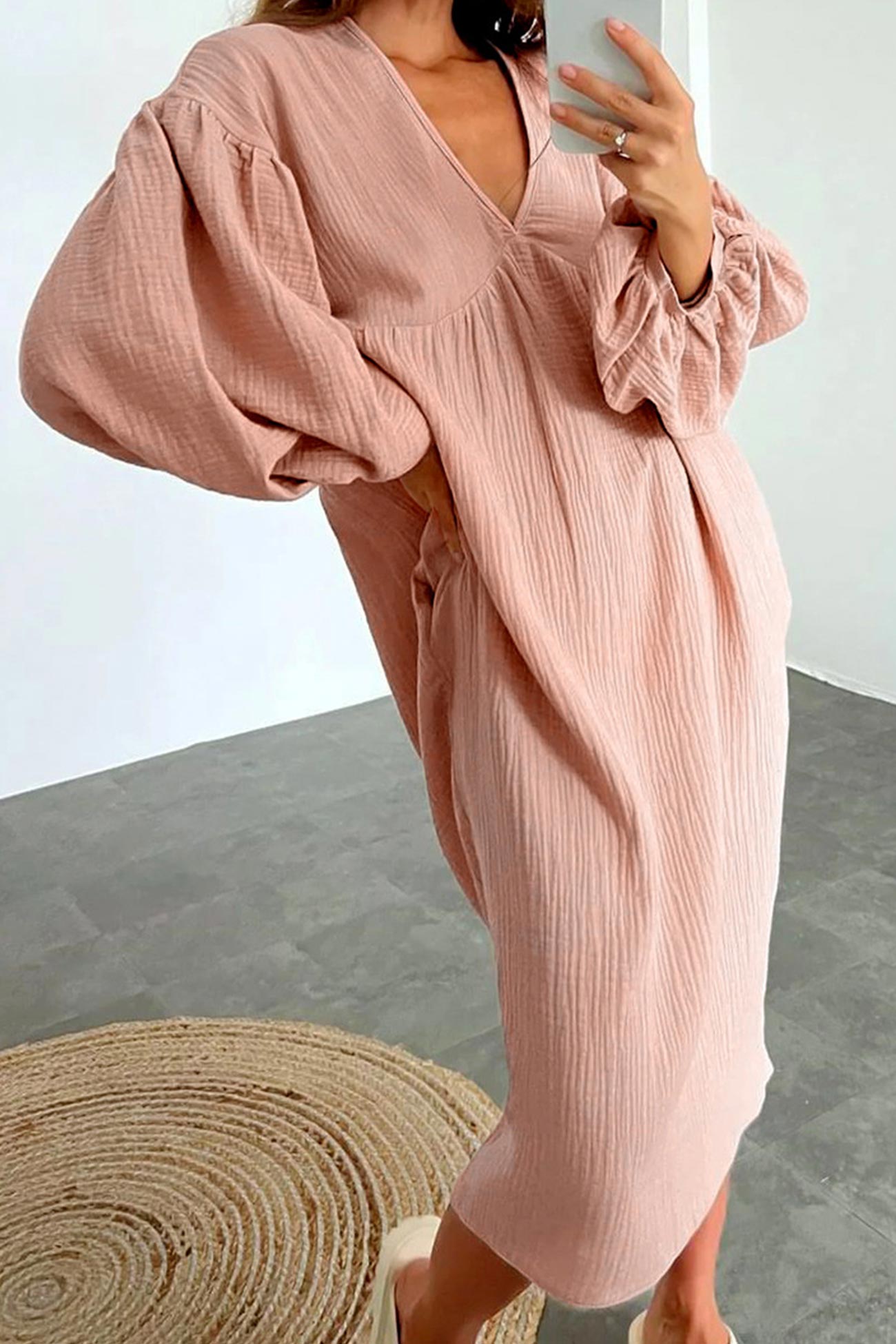 Lockeres Kleid aus Doppelkrepp mit V-Ausschnitt und Puffärmeln
