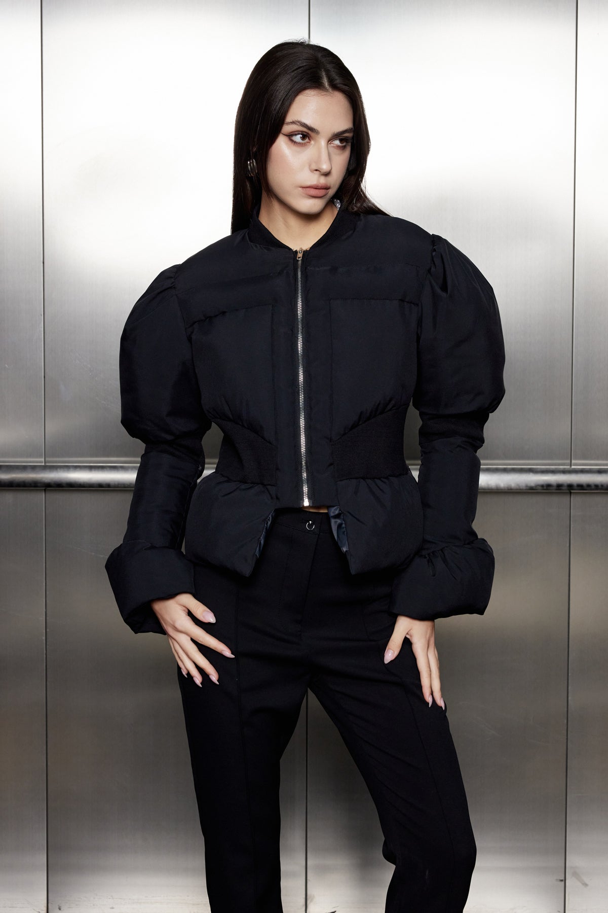 Erleben Sie den luxuriösen Flair unserer Emily Padded Satin Down Peplum Jacket in klassischem Schwarz! Fühlen Sie sich von Eleganz und Stil umhüllt und genießen Sie ultimativen Komfort.