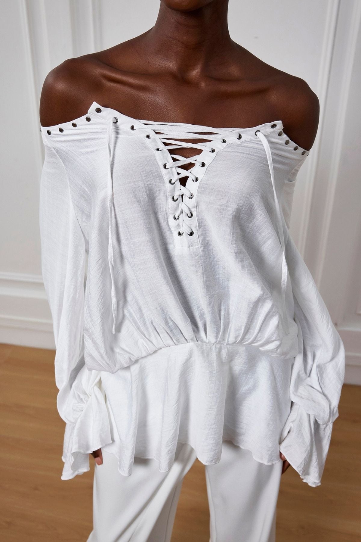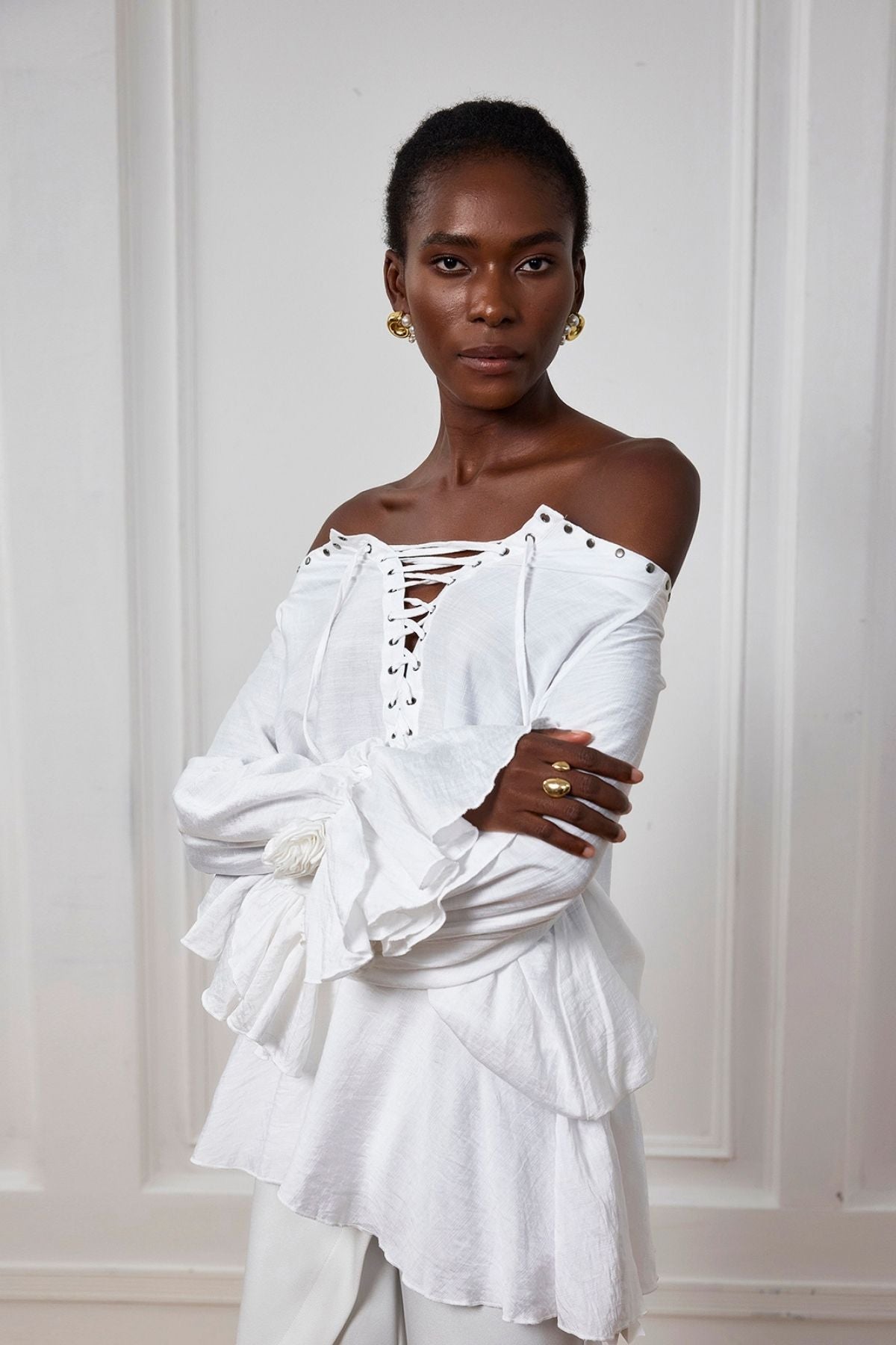Das fachmännisch gefertigte Kai Lace Up Flower Ruffle Top mit Schnürung und zarten Blumenrüschen verleiht jedem Outfit einen Hauch von Eleganz. Hergestellt aus hochwertigen Materialien bietet dieses Top Komfort und Stil für einen vielseitigen und eleganten Look.