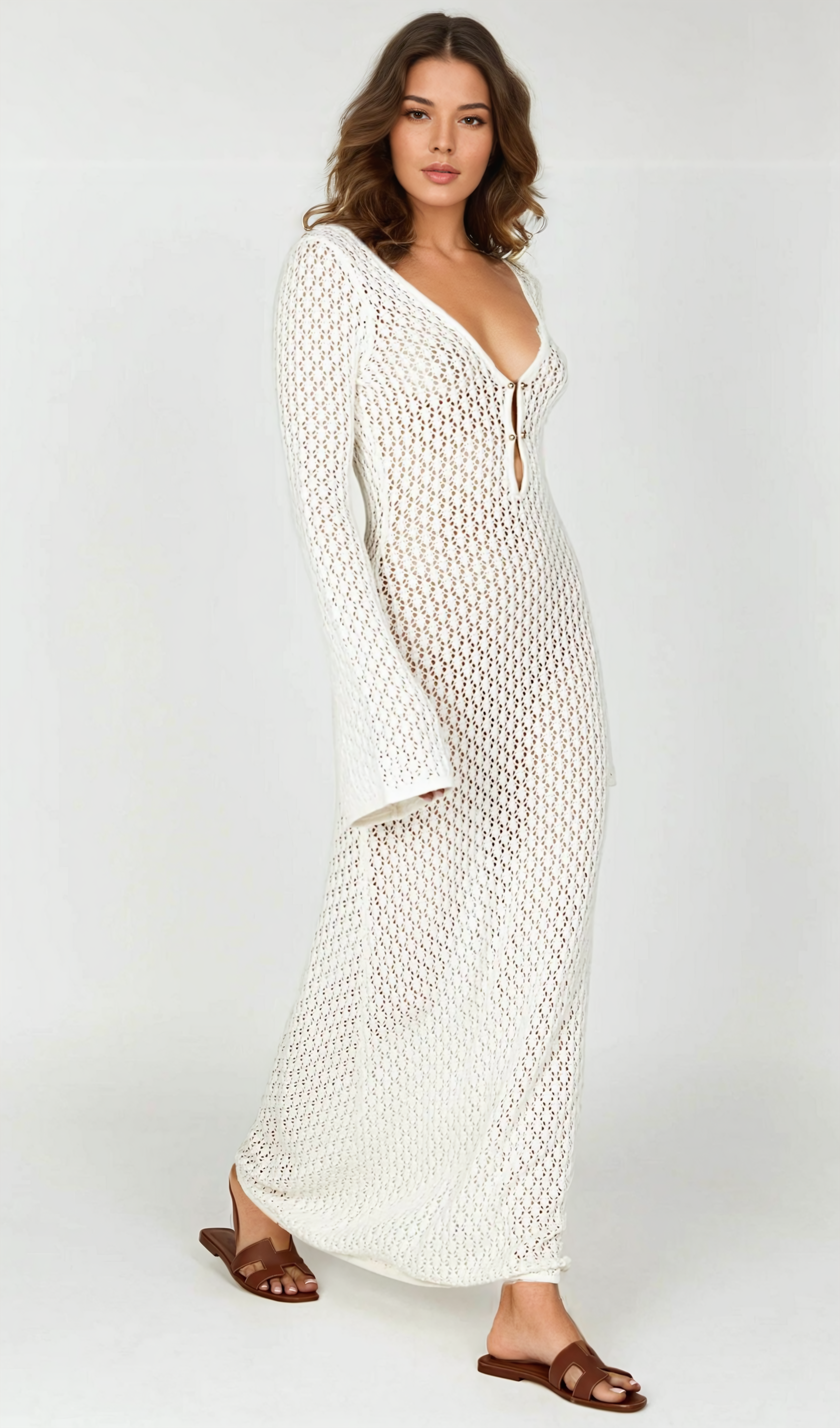 Lana – Weißes Maxikleid mit tiefem Ausschnitt und Strick