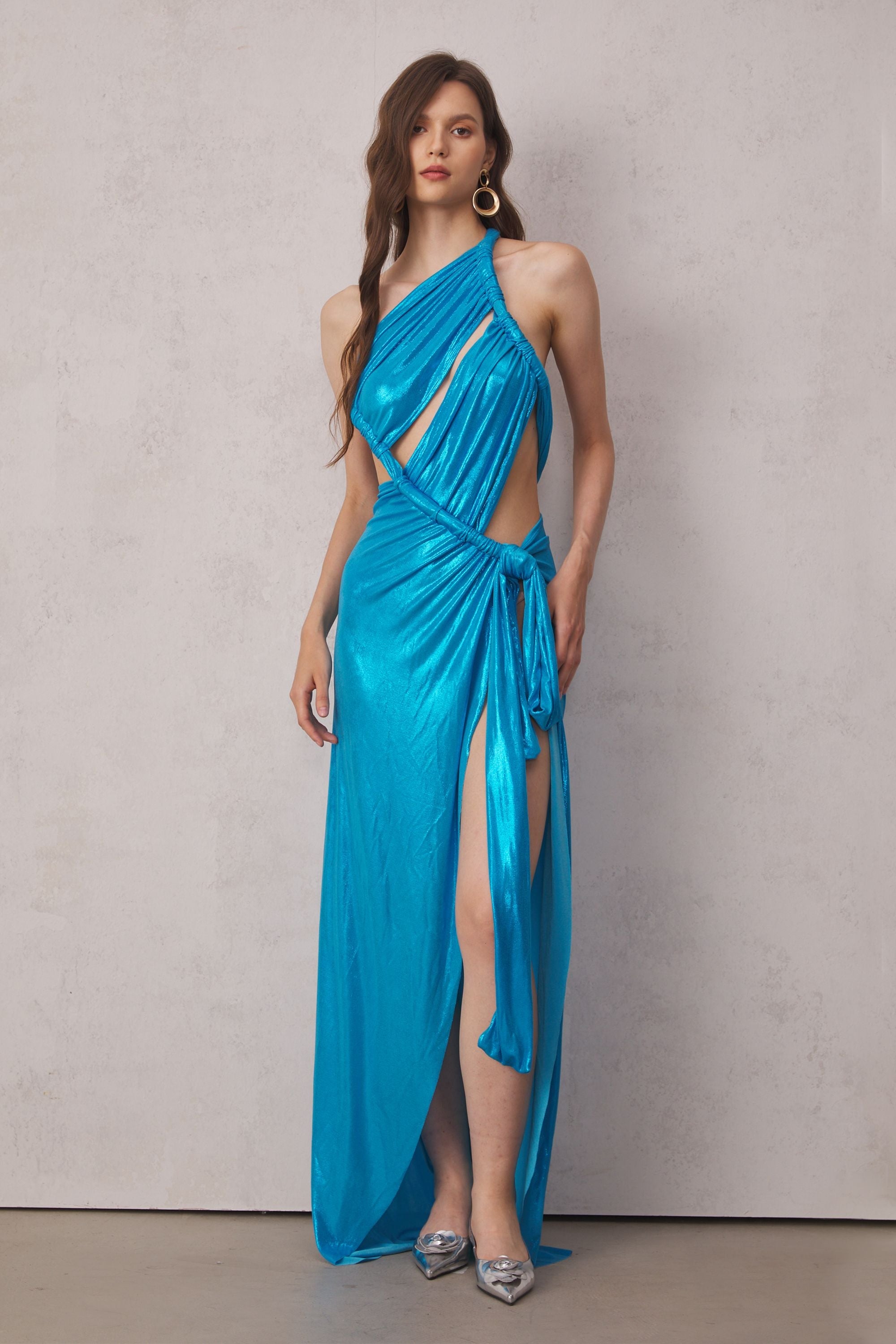 Wir präsentieren das Elise Metallic Split Maxikleid in Blau. Eine atemberaubende Ergänzung für jede Garderobe. Hergestellt aus schimmerndem blauem Stoff, ist dieses Kleid perfekt für besondere Anlässe oder einen Abend. Der geteilte Saum verleiht einen Hauch von Eleganz, während der metallische Glanz ihm einen modernen Touch verleiht.
