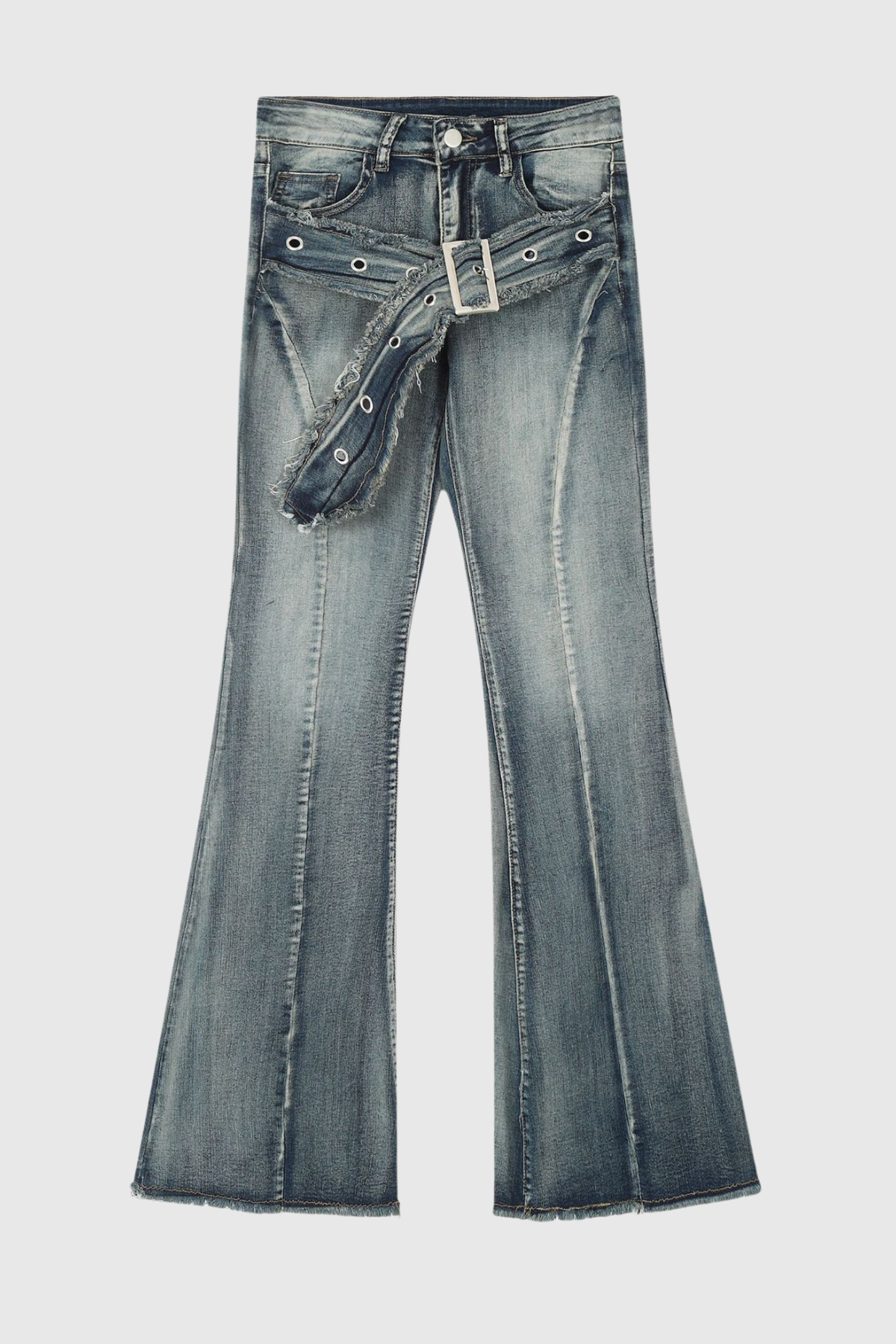 Werten Sie Ihre Jeansgarderobe mit der Melina Bootcut-Jeans mit Schnallenverzierung in Blau auf. Die eleganten Schnallenverzierungen verleihen dieser Bootcut-Jeans einen Hauch von Raffinesse und werten Ihren Alltagslook auf. Hergestellt aus hochwertigem Material für eine bequeme und schmeichelhafte Passform. Perfekt für jeden Anlass.