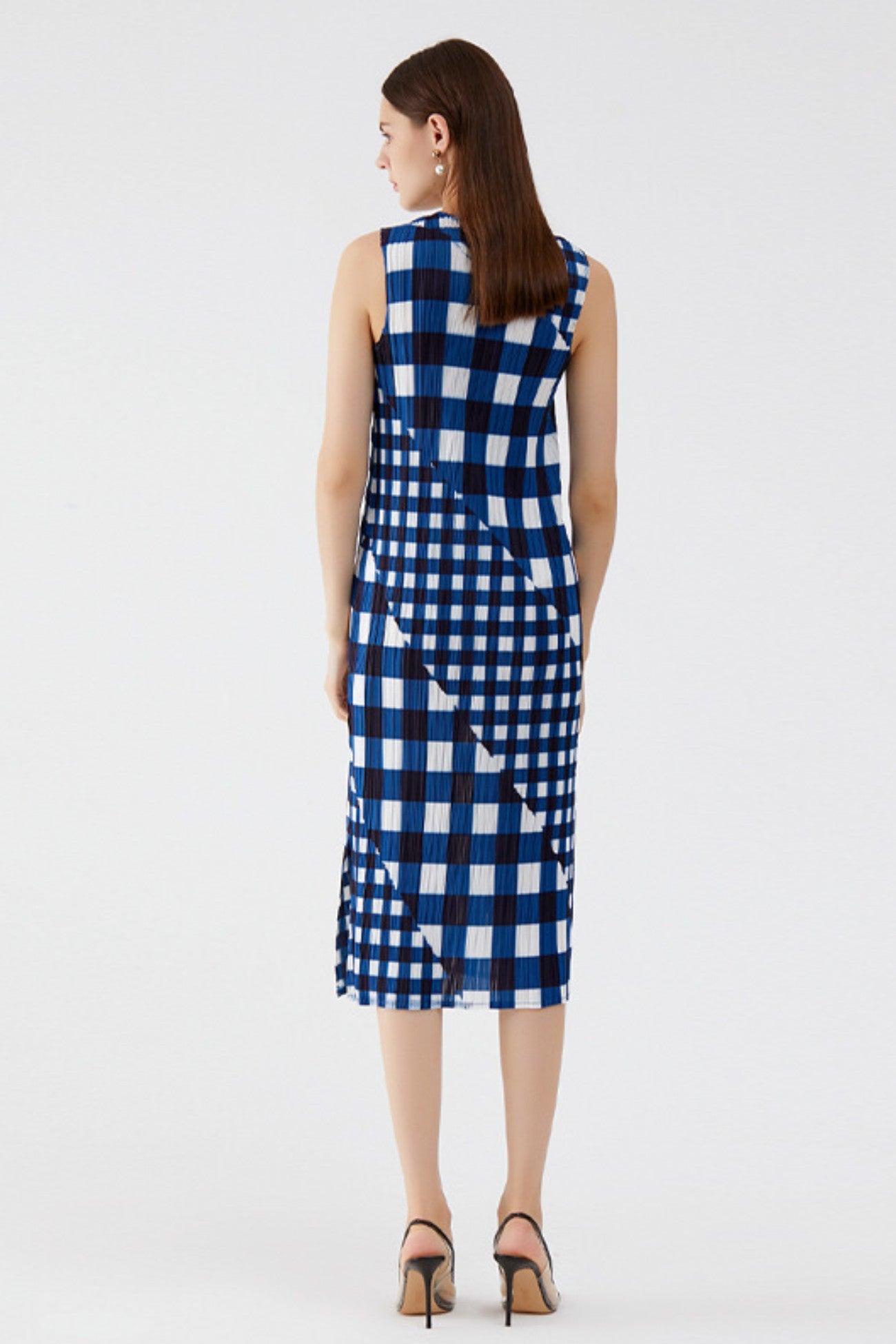 Minimalistisches Design mit maximaler Textur. Durch das plissierte Design zeigt das Kleid sanft fließende Bewegungen. Besonders dieses ärmellose karierte Kleid besticht durch seine Leichtigkeit. Das bequemste Kleidungsstück für Ihren Alltag.