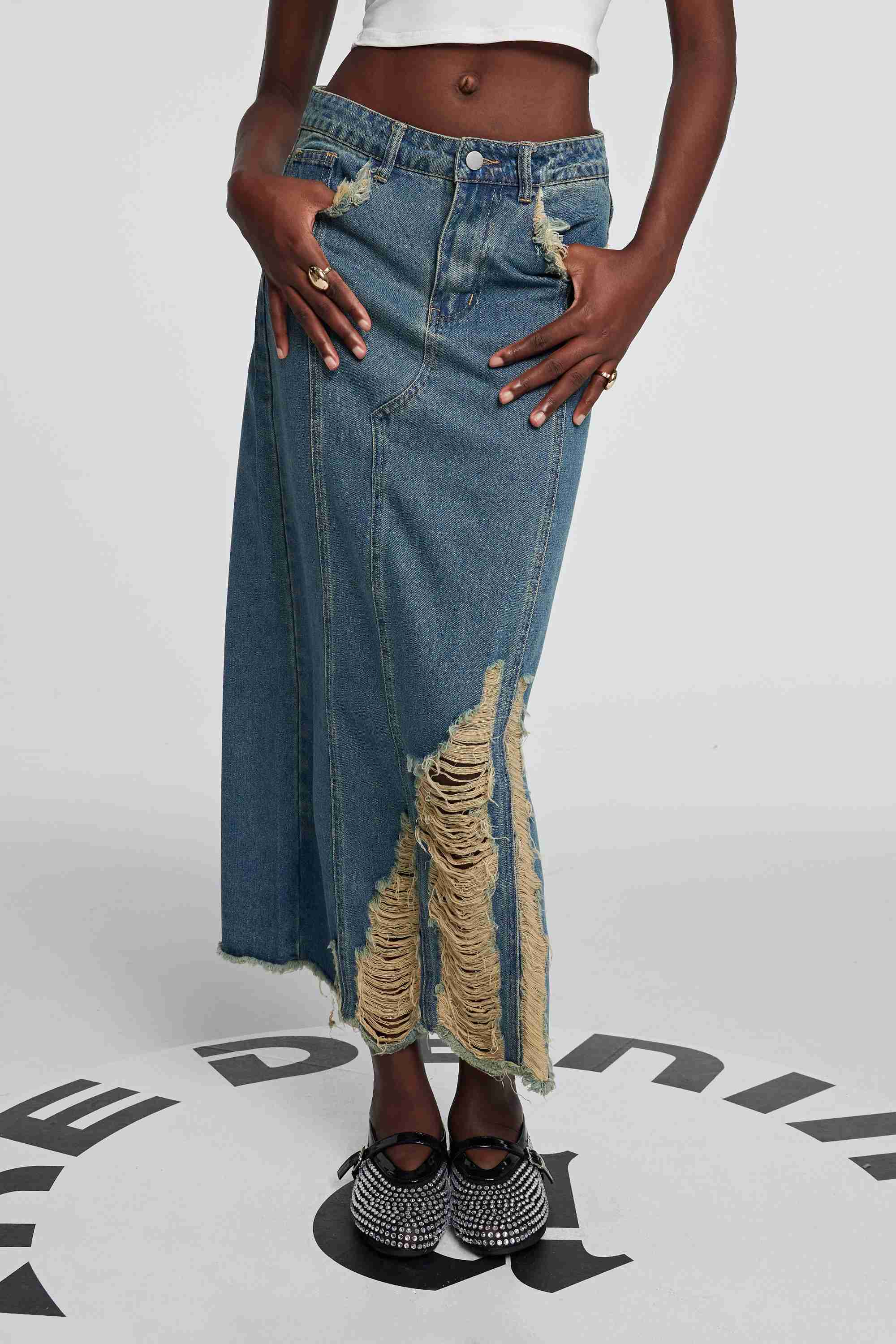 Dieser Sharon Torn Jeansrock ist aus hochwertigem Denim gefertigt und besticht durch sein einzigartiges Used-Design, das jedem Outfit einen Hauch von Extravaganz verleiht. Der strapazierfähige Stoff und die stilvollen Details machen ihn zu einer vielseitigen und langlebigen Ergänzung für jede Garderobe.