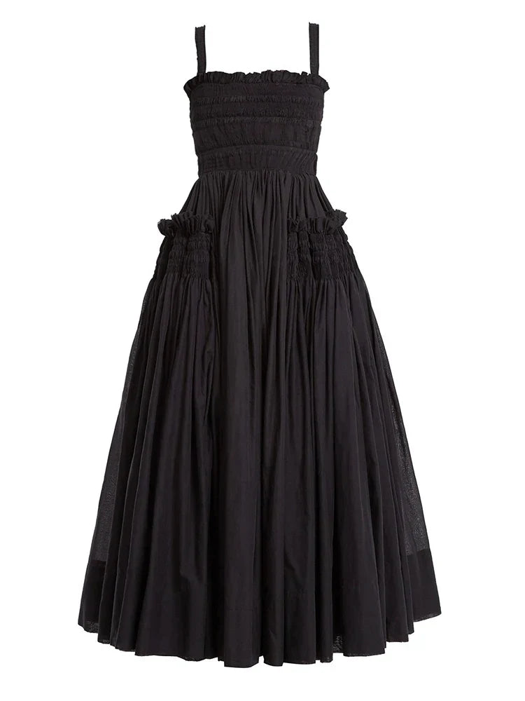 Dieses lange Kleid besteht aus einem gerafften und bestickten Stoff mit Ziernähten und bietet eine bequeme und flexible Passform für alle Körpertypen.