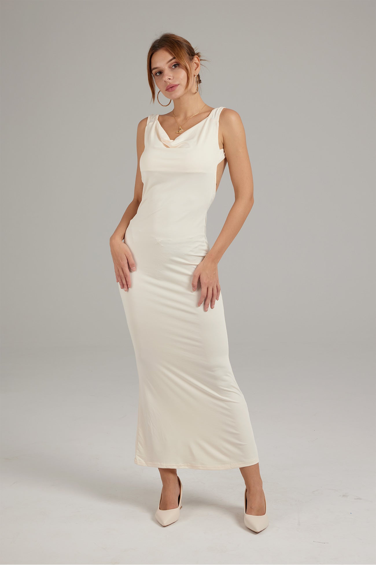 Einfarbiges, rückenfreies Hüftkleid mit Wasserfallausschnitt