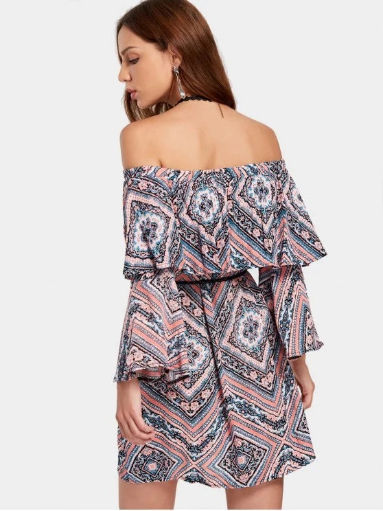 Insrs – Atemberaubendes Kleid mit Volant, ausgestellten Ärmeln und Gürtel im Tribal-Print