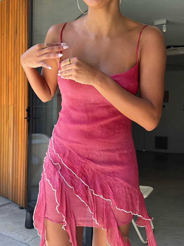 Beschreibung: Dieses Minikleid ist aus elastischem Netzstoff mit vollständig gefüttertem Design gefertigt. Es hat eine figurbetonte Silhouette, einen asymmetrischen Saum und lange Rüschenriemendetails am Körper.