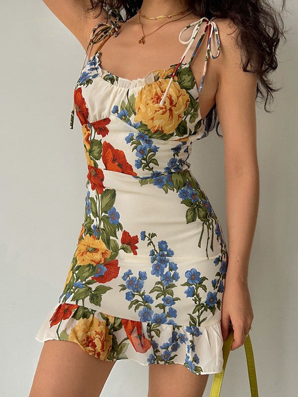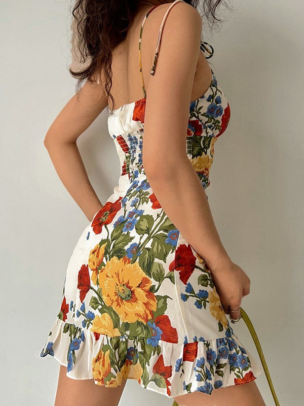 Beschreibung: Perfekt für Sommer- oder Urlaubsstimmung. Dieses Minikleid ist einfach perfekt. Es hat einen unregelmäßigen Blumendruck am Körper, einen Rüschenausschnitt, verstellbare Träger zum Binden und einen Rüschensaum. Der gesmokten Rücken sorgt für einen bequemen, elastischen Sitz.