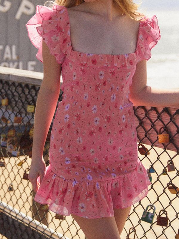 Beschreibung: Dieses Sommerkleid ist durchgehend mit Blumenmuster bedruckt. Es hat eine taillierte Silhouette mit kurzen, flatternden Tank-Ärmeln und Rüschenbesatz.