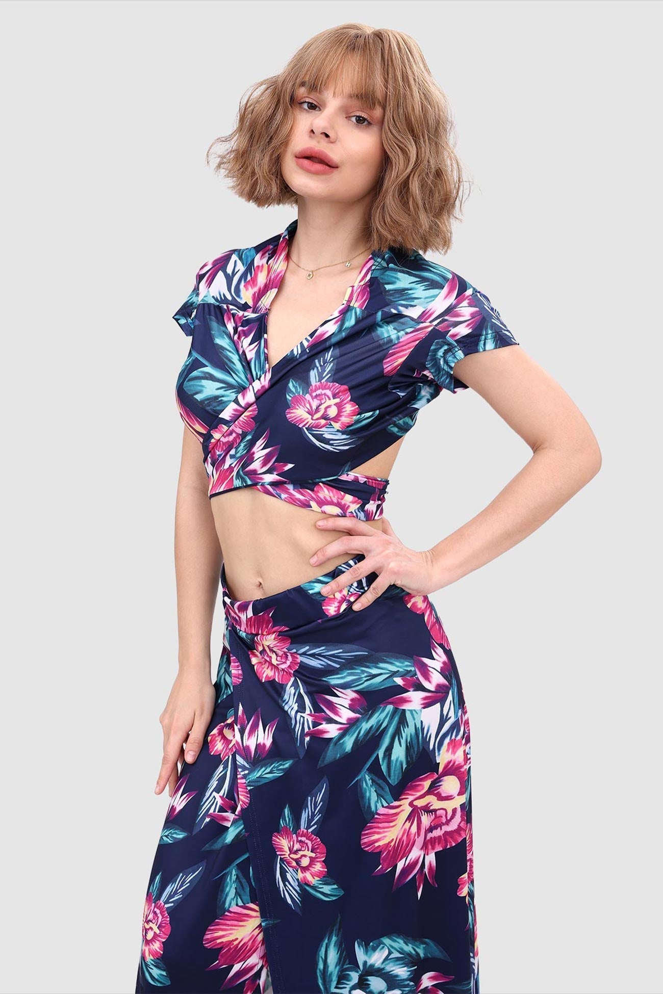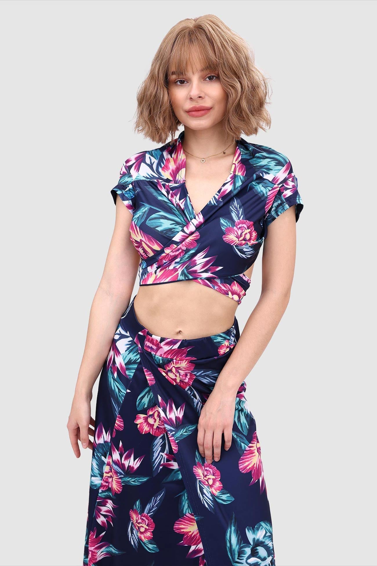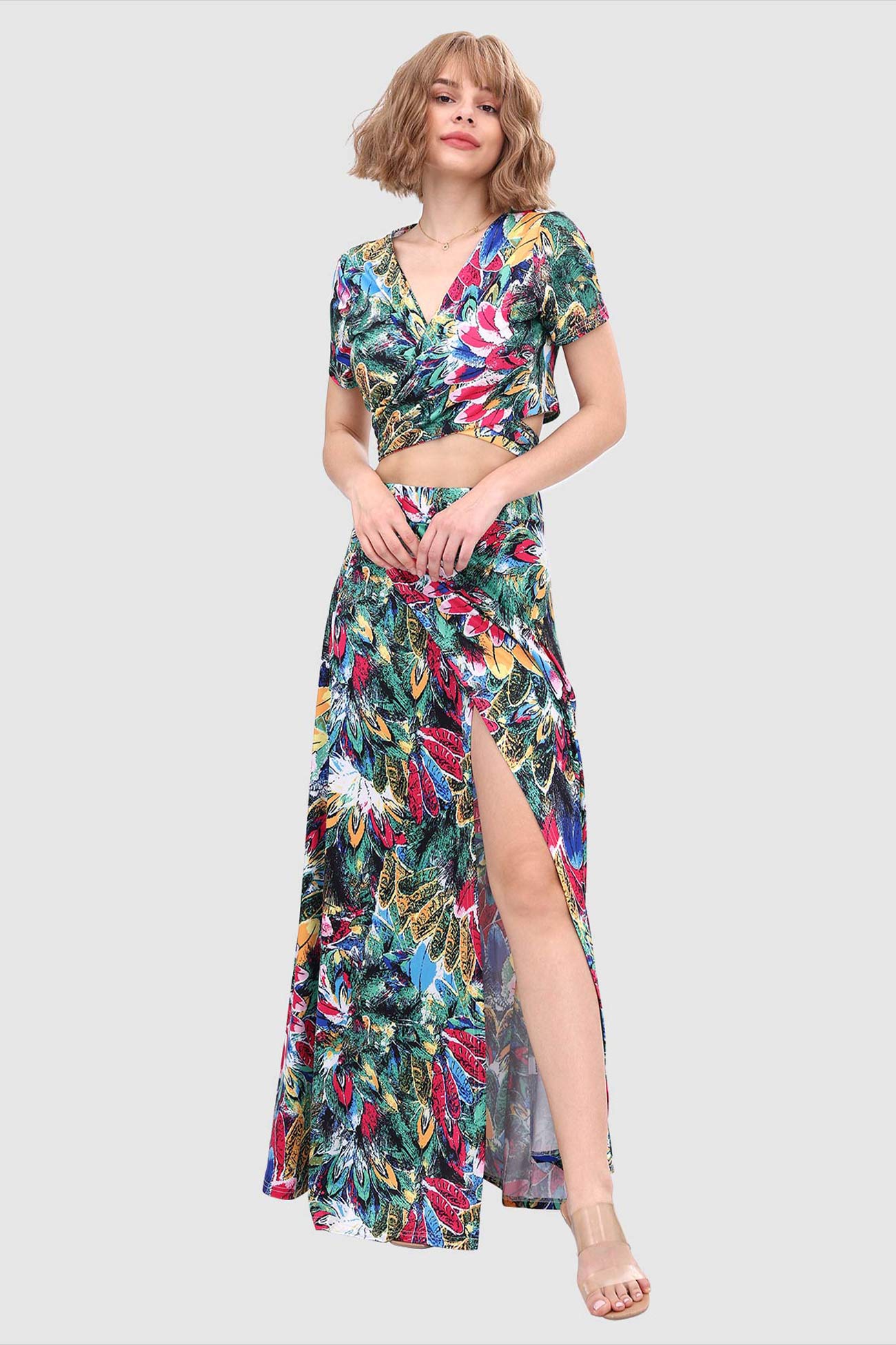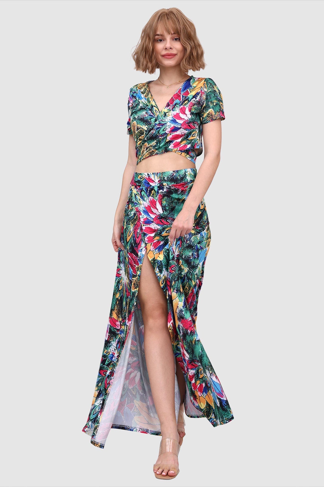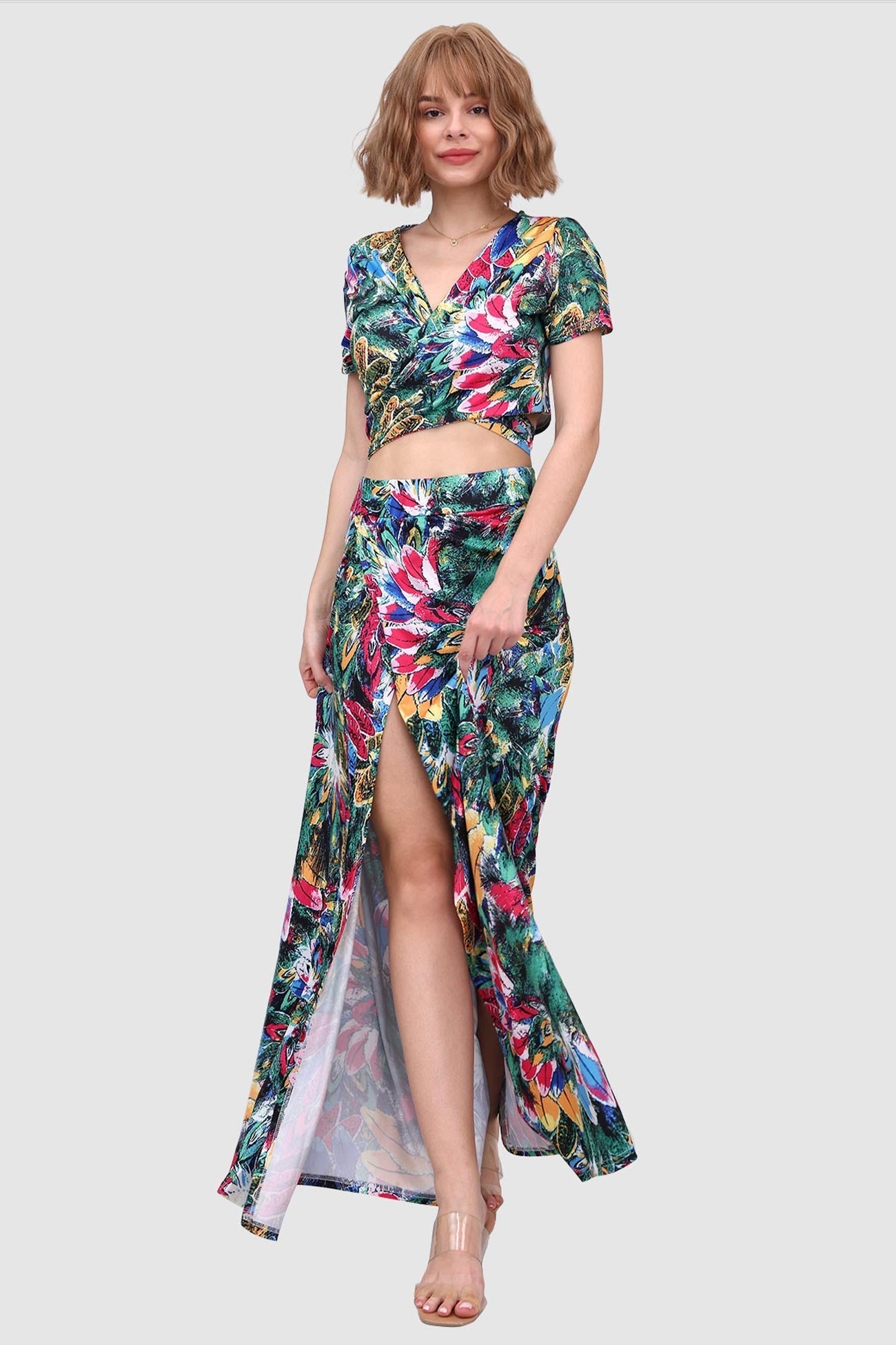 Kurzes Oberteil mit V-Ausschnitt und Schlitz vorne am Rock