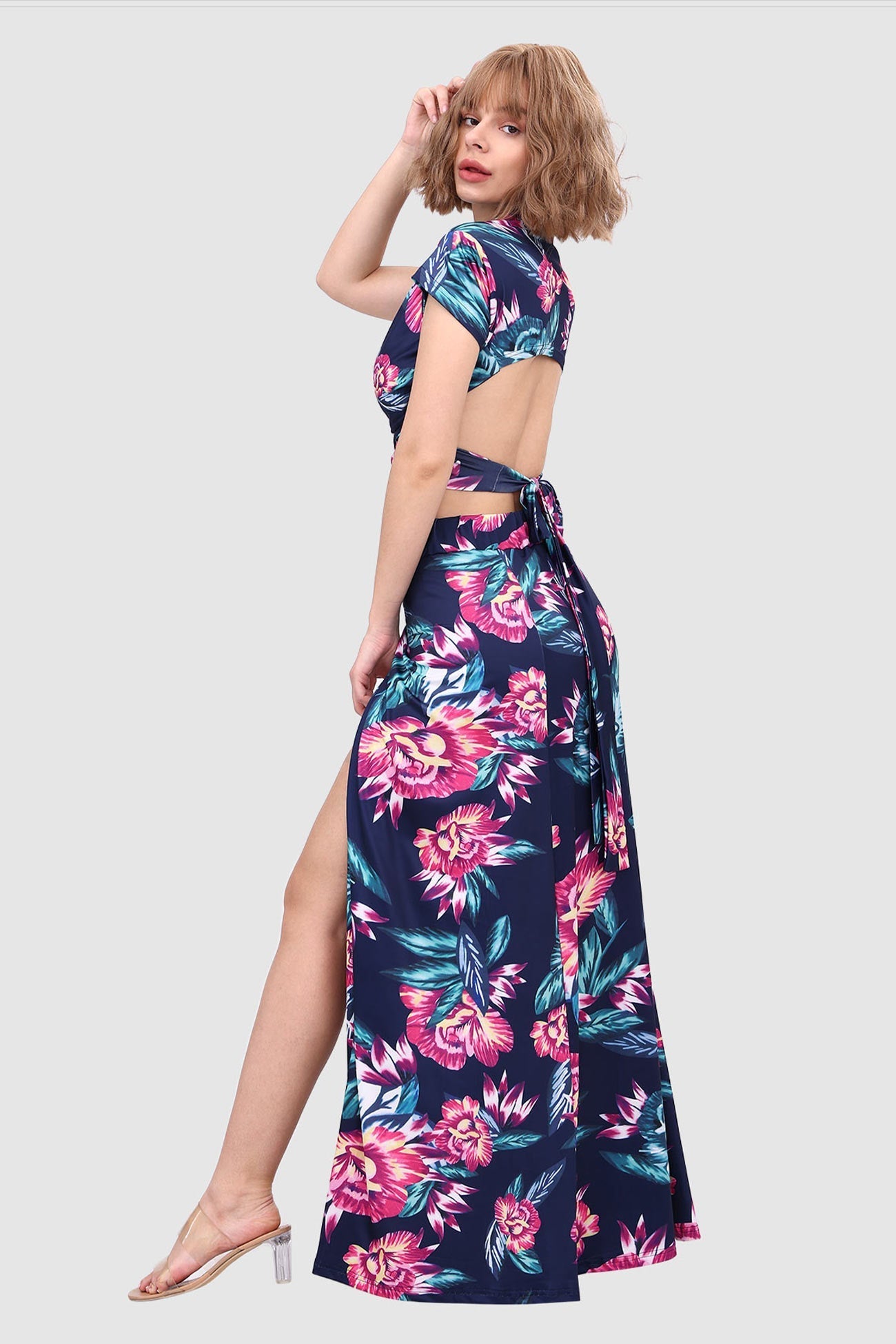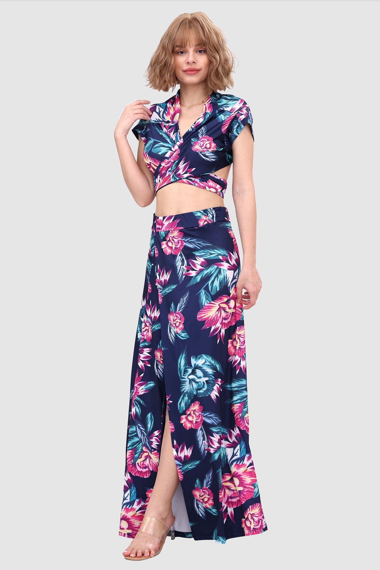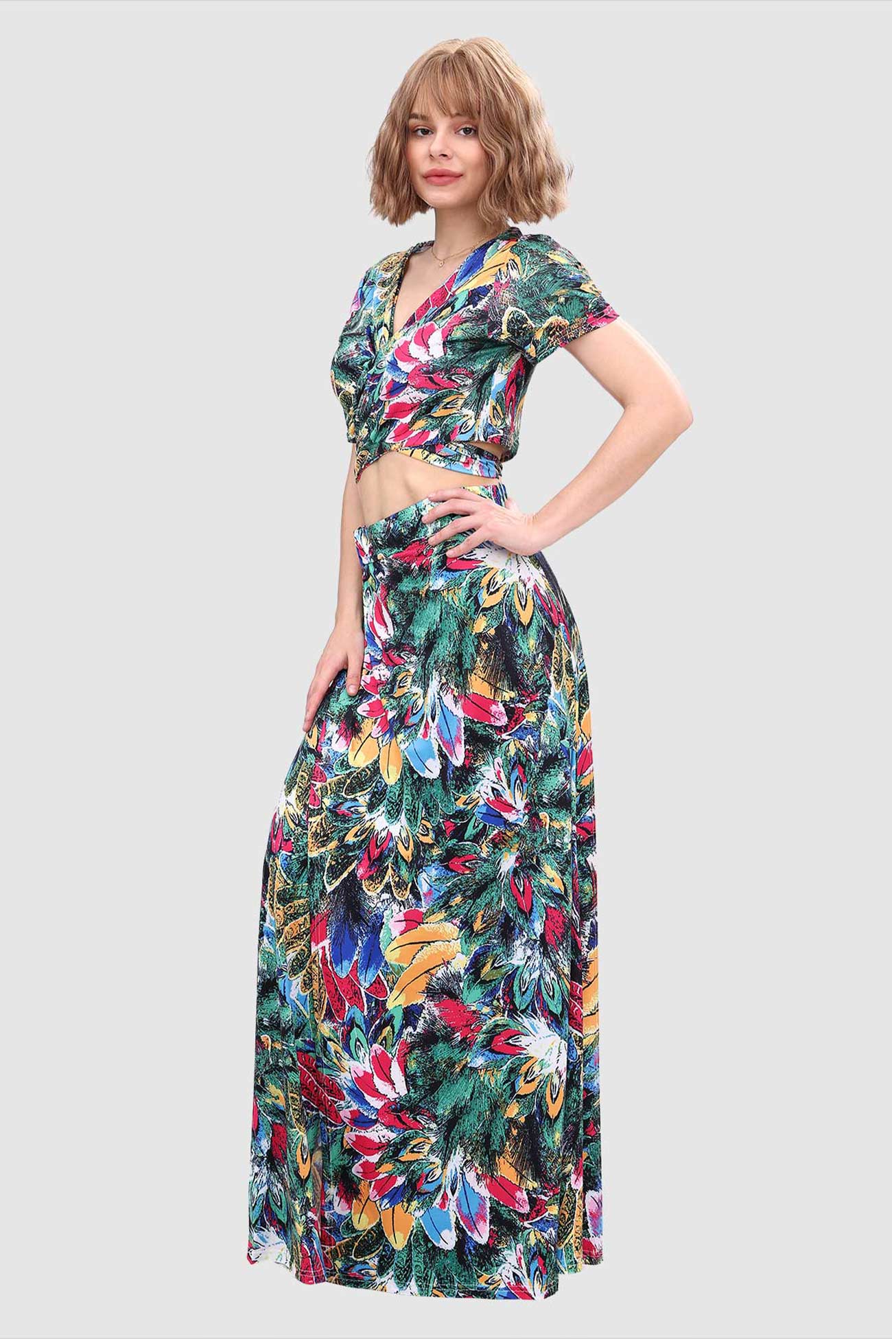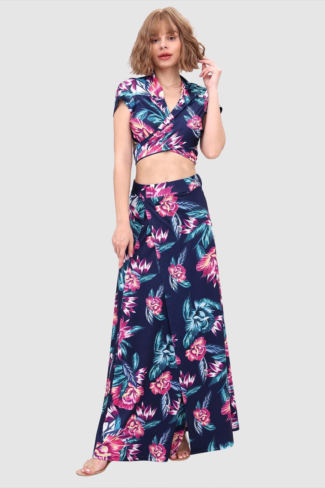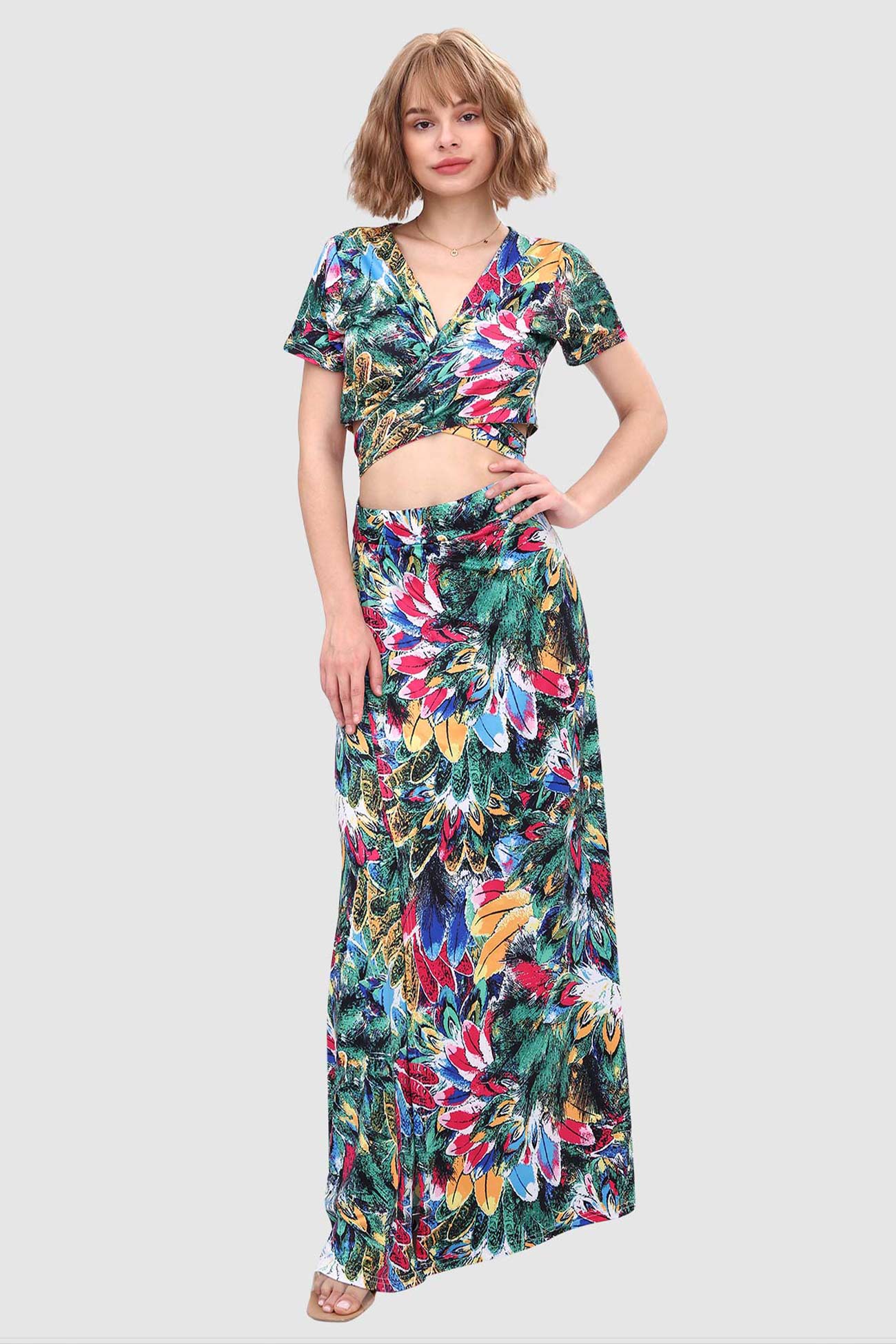 Kurzes Oberteil mit V-Ausschnitt und Schlitz vorne am Rock