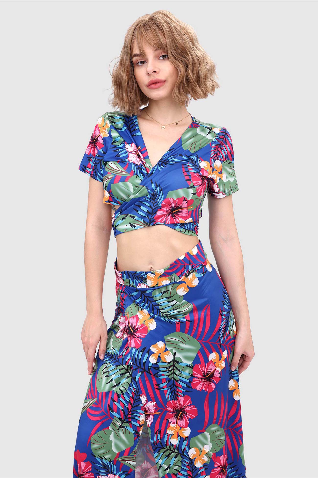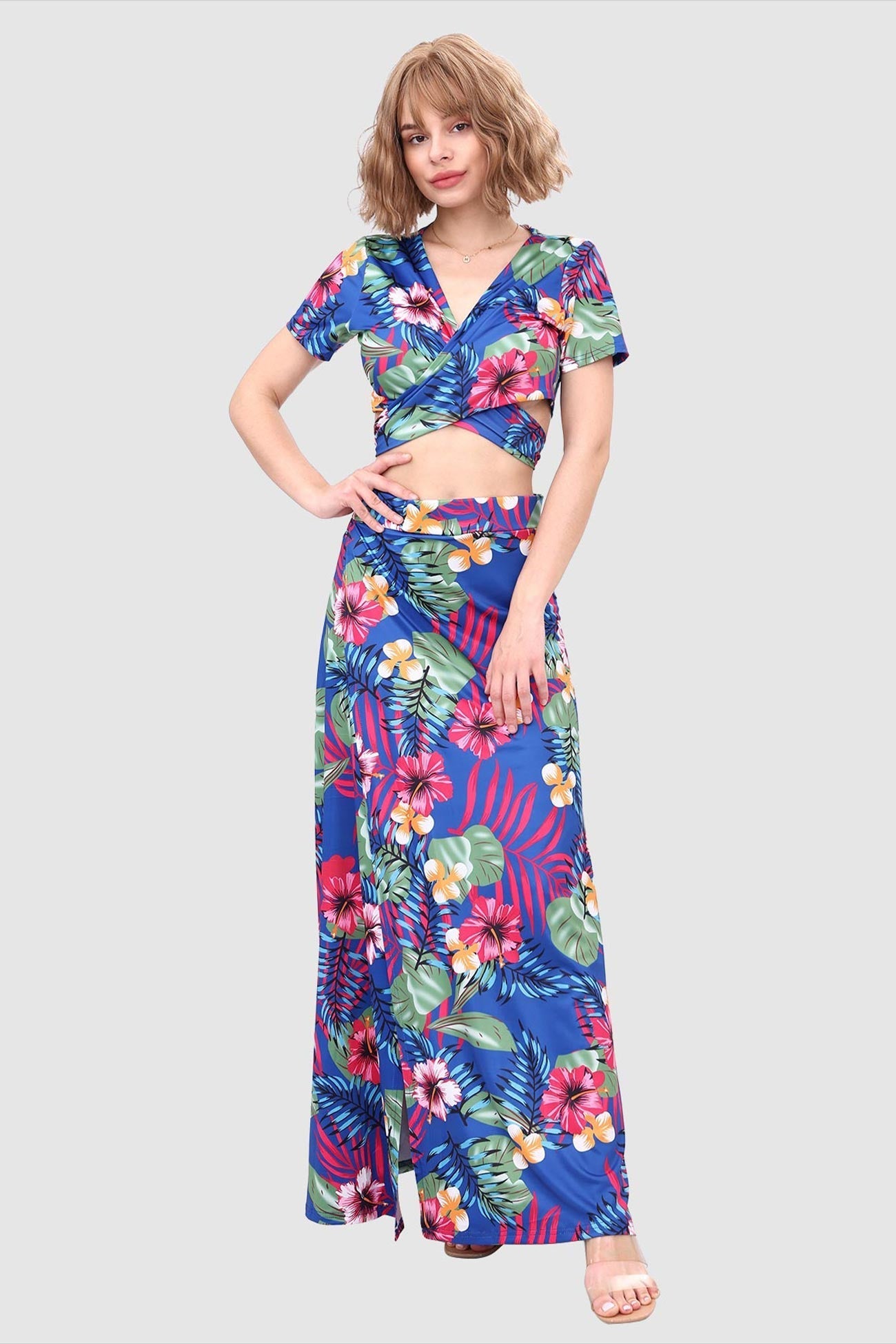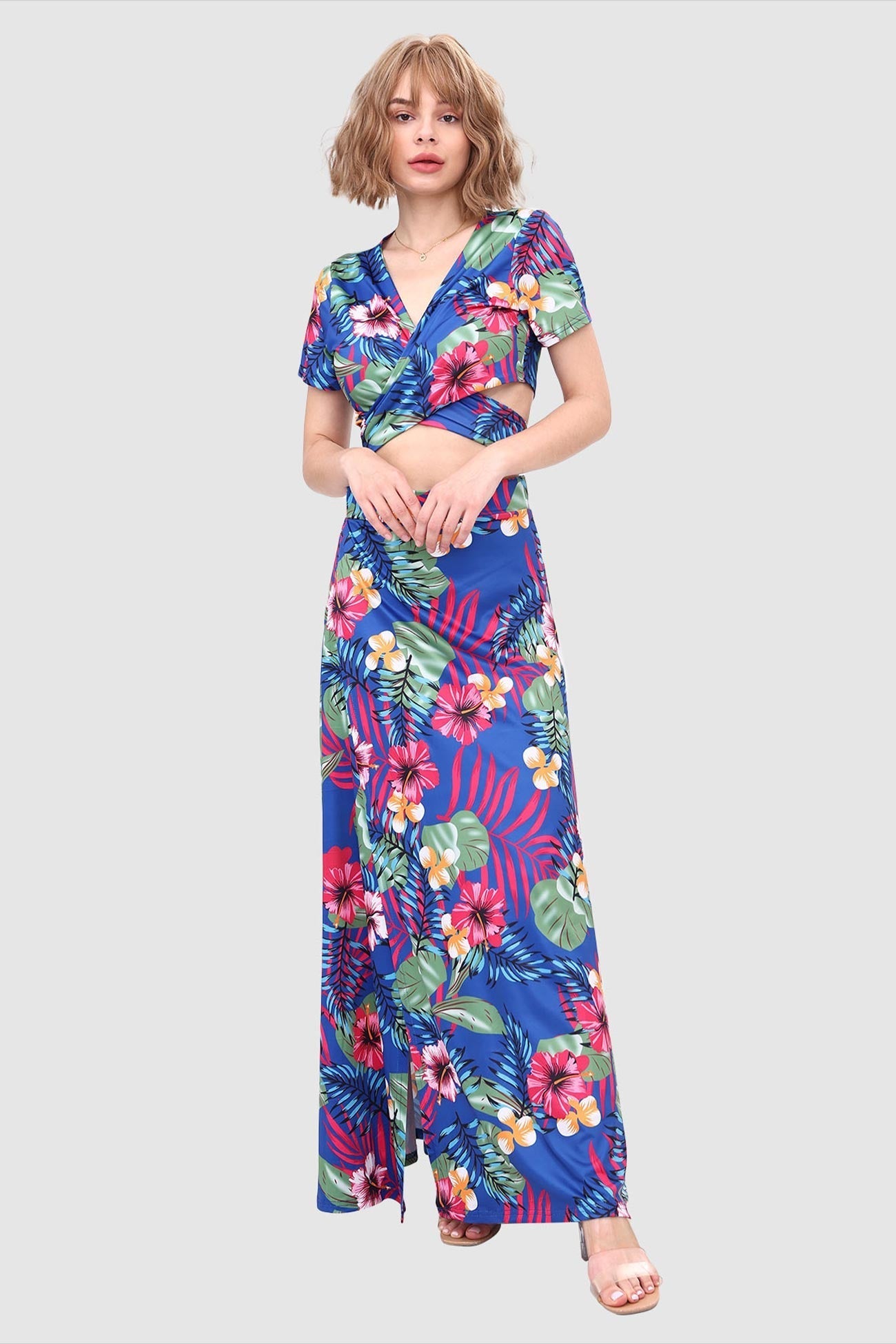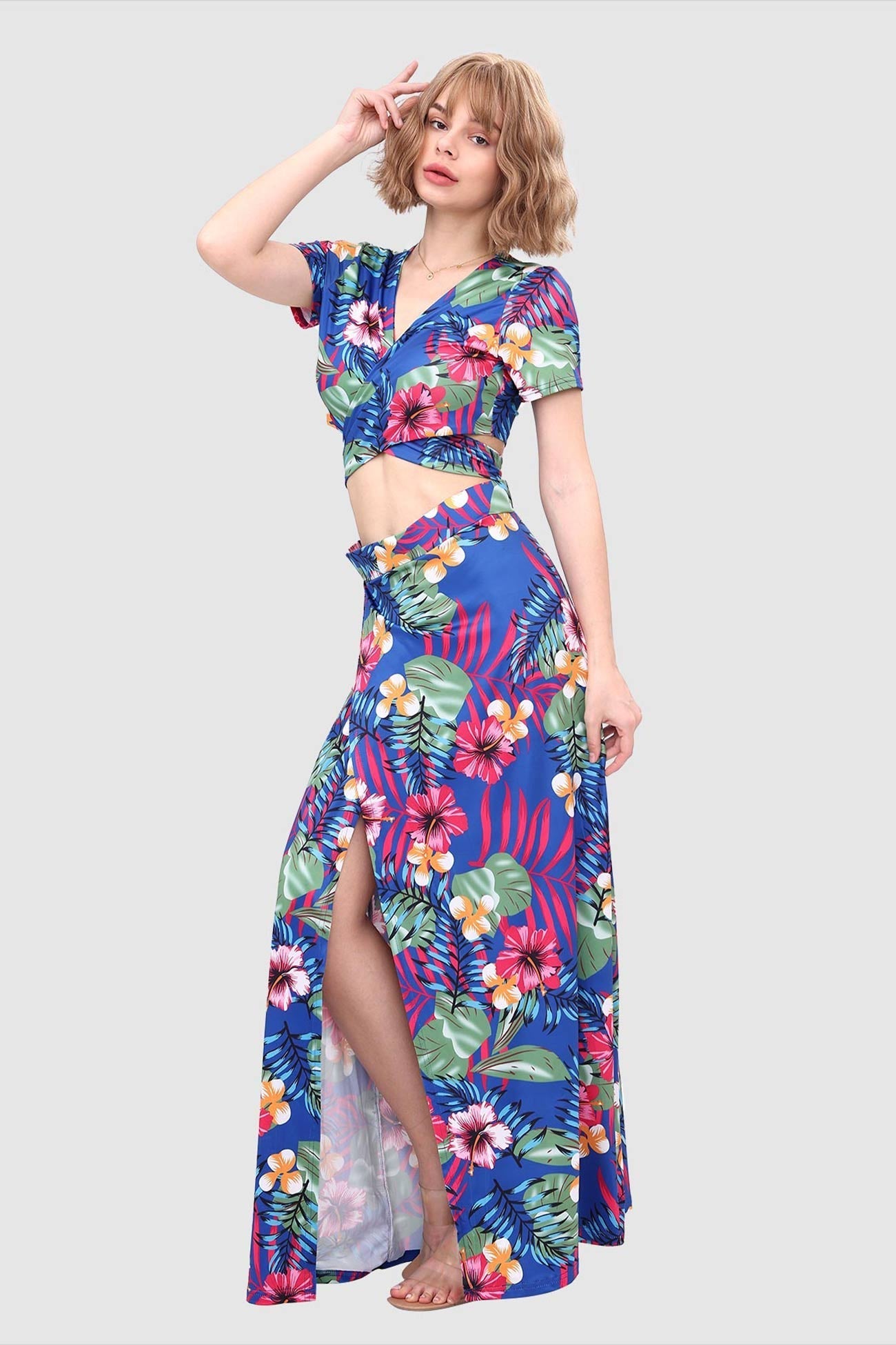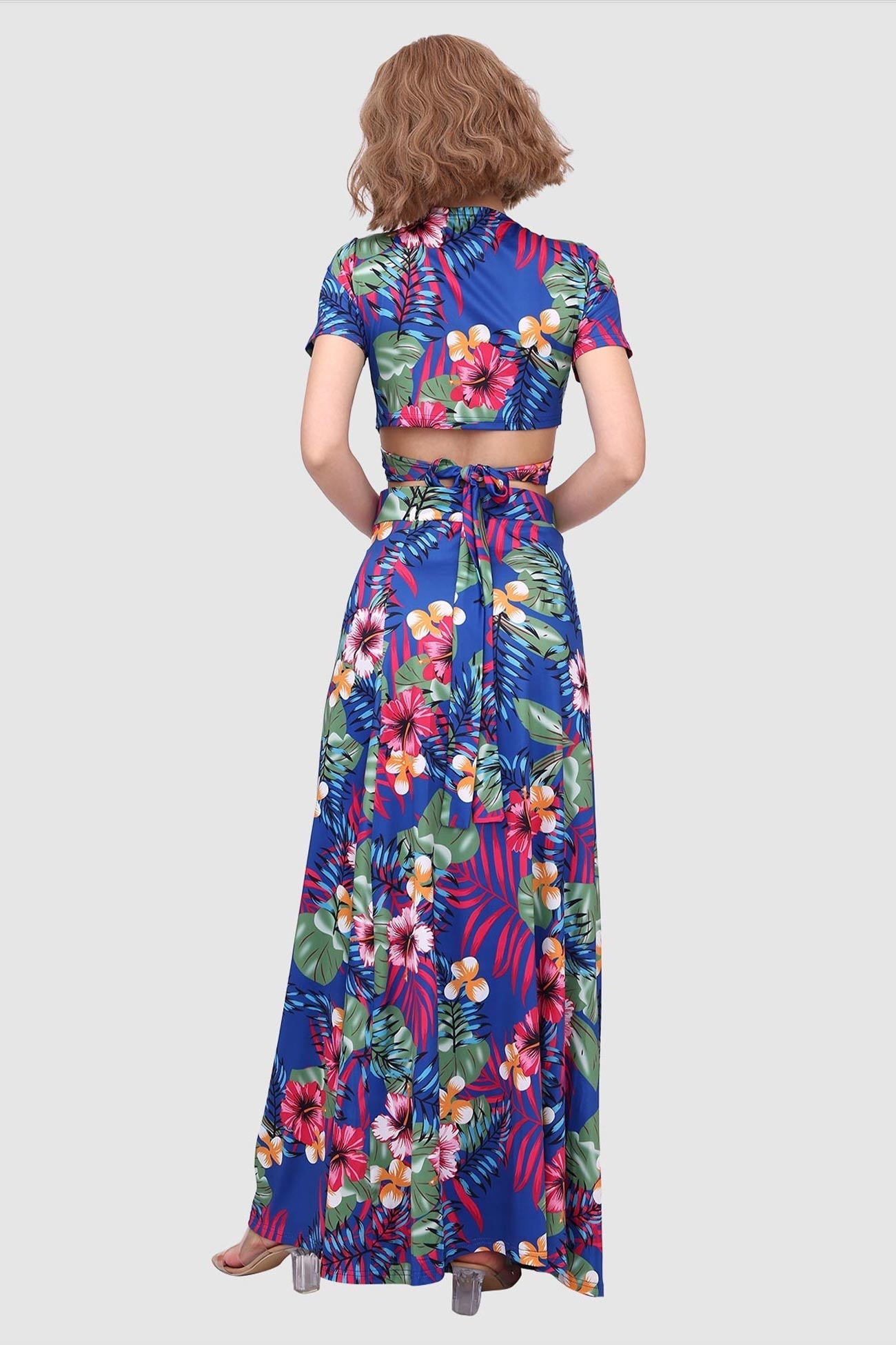 Zweiteiliges Kleid mit V-Ausschnitt, Rückenschnürung und Blattmuster