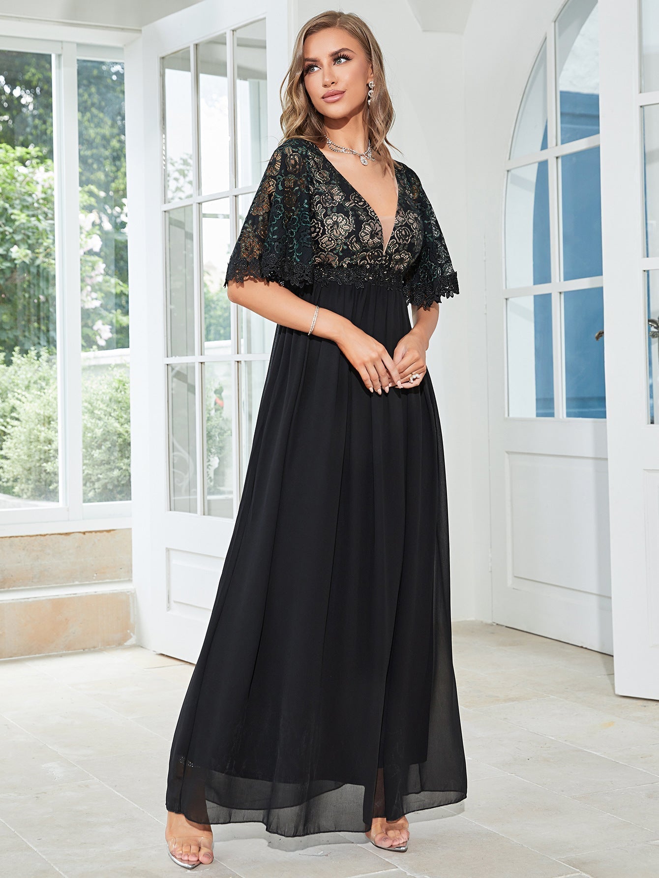 Color: Black Style: Elegant Pattern Type: Plain Details: Contrast Mesh. Contrast Lace Neckline: Deep V Neck Type: A Line Sleeve Length: Short Sleeve Sleeve Type: Flounce Sleeve Waist Line: High Waist Hem Shaped: Flared Length: Long Fit Type: Regular Fit Fabric: Non-Stretch Material: Chiffon Composition: 100% Polyester