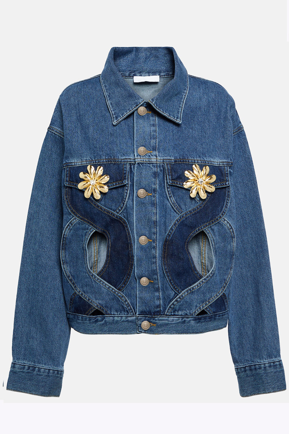 Find purpose and style with the Abigail Embellished Hollow Denim Jacket. This long-sleeved jacket is crafted from durable denim and features delicate flower-embellished designs that add a graceful touch. Ideal for the office or a night out. it's a wardrobe essential.