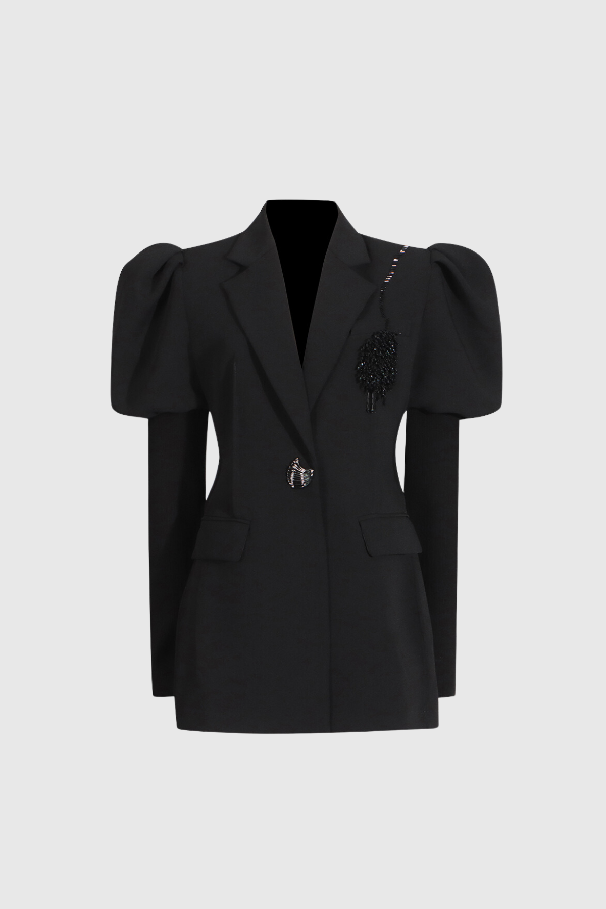 Elevate any outfit with the Adabella Balloon Sleeve Rhinestone Blazer. This blazer features unique balloon sleeves and rhinestone detailing for a touch of glam. Perfect for completing a professional look or adding a stylish twist to your favorite jeans and t-shirt combo.
