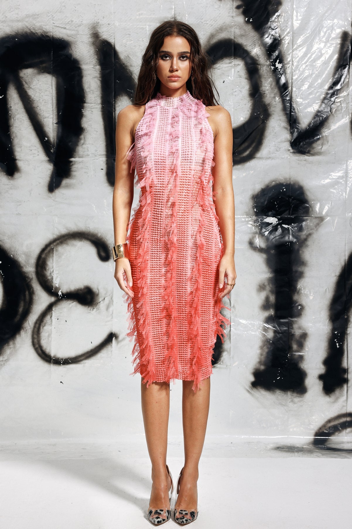 Introducing the Adhara Fringe Mesh Ruch Midi Dress In Red. your new go-to statement piece. Combining sleek mesh fabric. stunning ruched detailing. and a playful fringe trim. this dress is designed to turn heads. Perfect for any event. it effortlessly exudes confidence and style.
