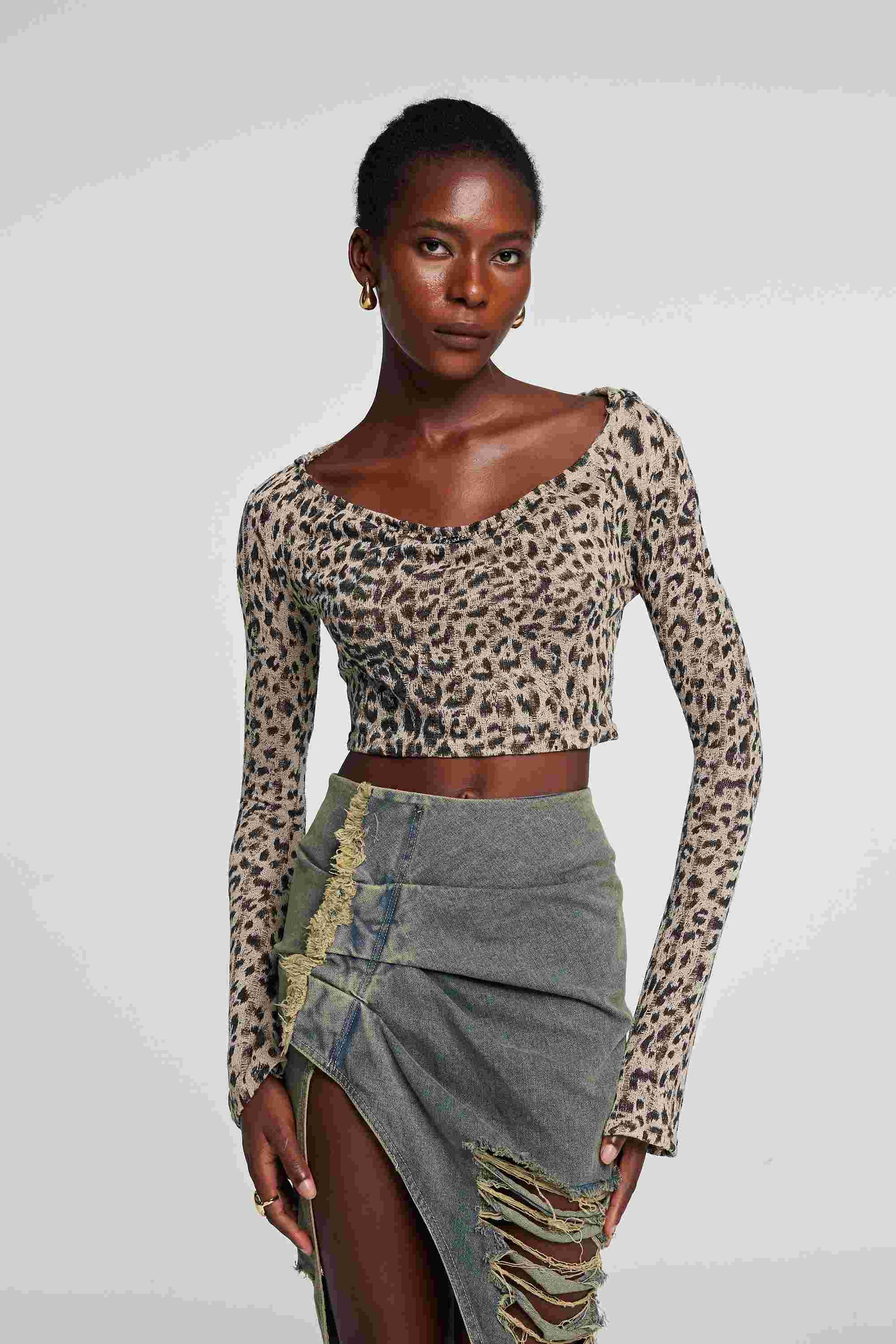 Expertly designed for a fierce yet comfortable look. the Delta Long Sleeve Leopard Torn Crop Top is a must-have piece for any fashion-forward wardrobe. Made with quality materials. this top features a trendy leopard print and stylish torn design. Elevate your style with this versatile and chic crop top.