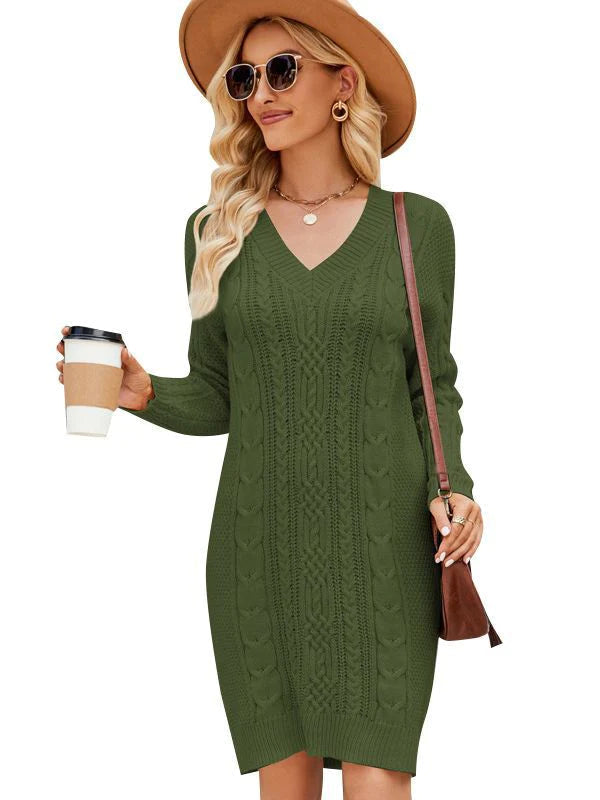 Insrs - FASHION SOLID COLOR V-NECK LONG SWEATER DRESS