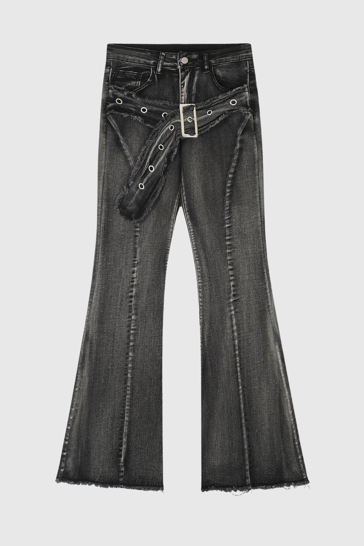 These Melina Buckle Embellished Bootcut Jeans in Black provide both style and comfort. The buckle embellishments add a touch of sophistication. while the bootcut design elongates the legs. Made with high-quality materials. these jeans are durable and versatile. making them a must-have addition to any wardrobe.