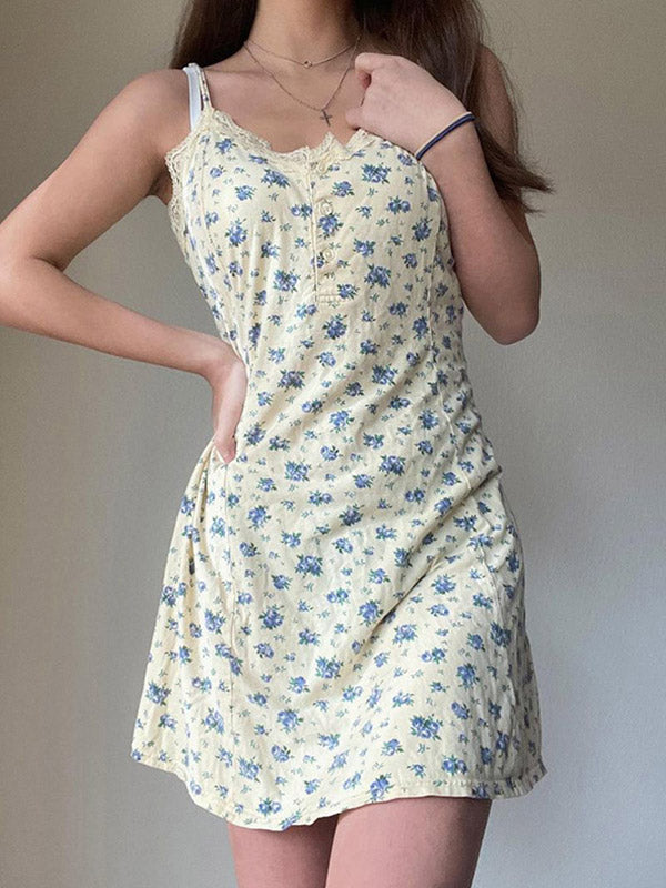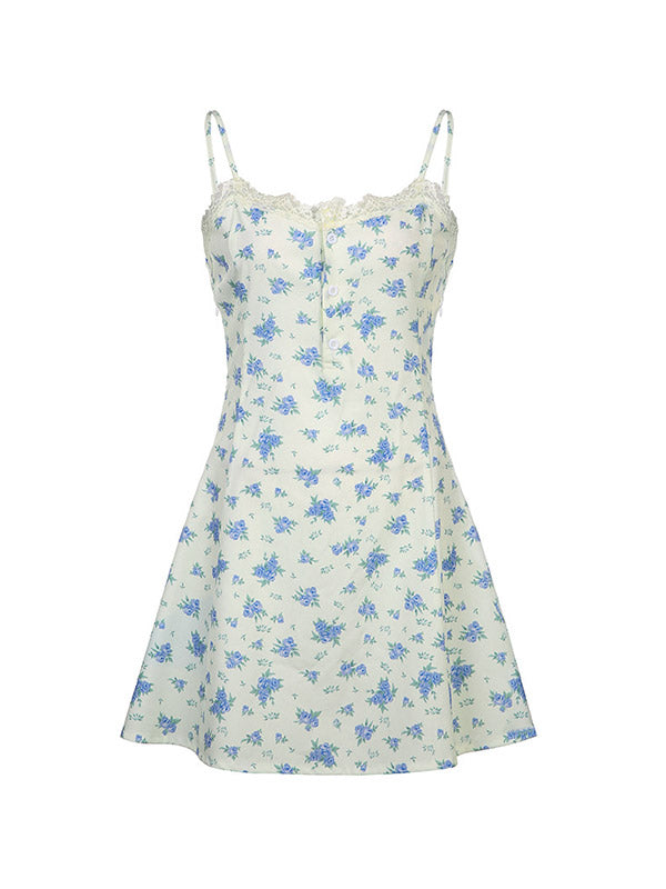 Description: With allover floral print. this mini dress features adjustable shoulder straps design. with lace paneling trim along the collar. complete with button fastening at front.