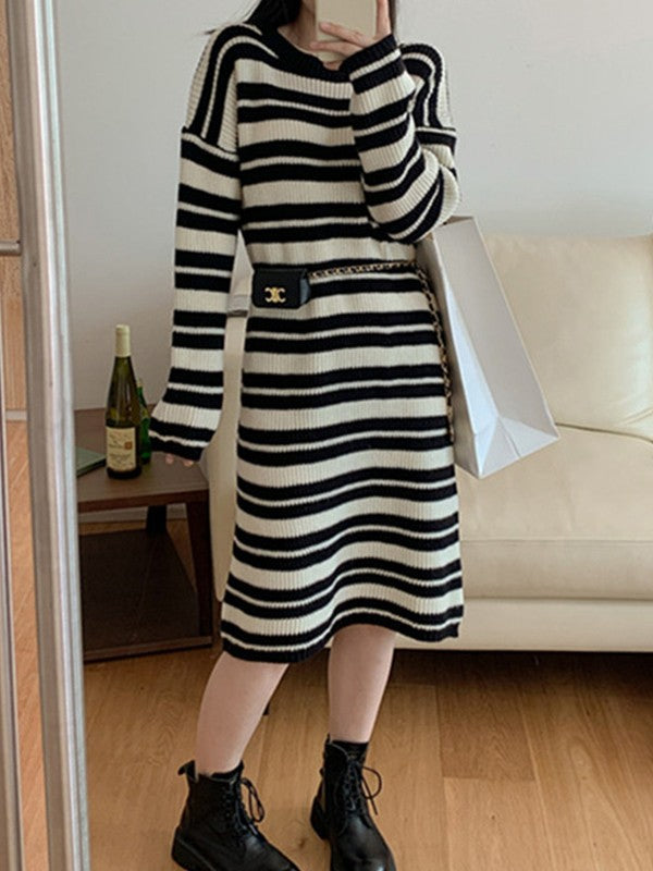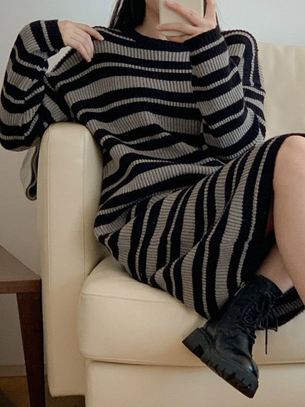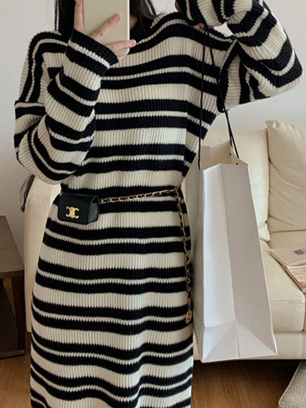 Description: This staple but retro long dress cuts to a relaxed silhouette. features contrast striped pattern allover. and has dropped long sleeves design.