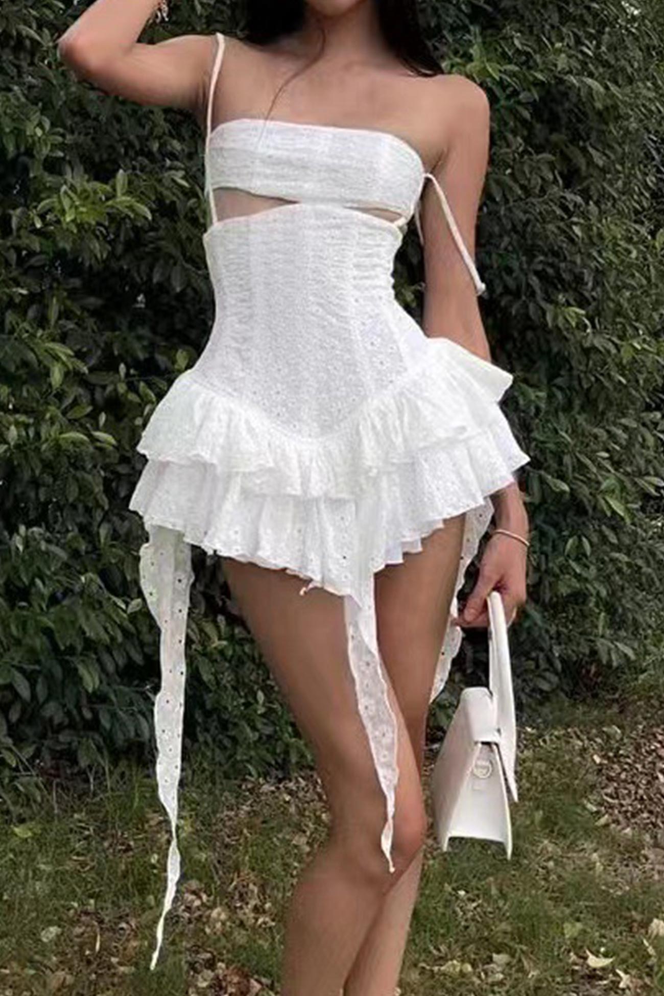 White Jacquard Cutout Ruffle Dress